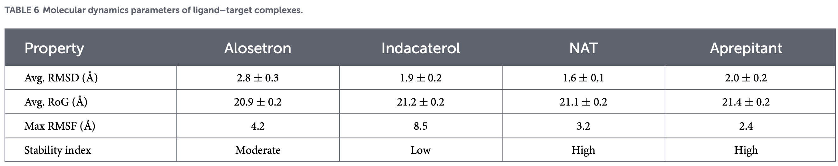 "abstract": "<jats:sec>\n <jats:title>Background</jats:title>\n <jats:p>Long COVID-19 causes neurophysiological, cardiopulmonary, and musculoskeletal issues. Increased neuropeptides and cytokines lead to neuroinflammation, resulting in neurocognitive impairments, fatigue, depression, anxiety, and severe cognitive deficits. The Neurokinin 1 receptor (NK1R) is a cellular receptor for the neuropeptide Substance P, and its dysregulation links to neuropsychological issues despite antipsychotic use.</jats:p>\n </jats:sec>\n <jats:sec>\n <jats:title>Objectives</jats:title>\n <jats:p>In the present study, neuropsychological sequelae related to long COVID-19 were screened and the expression of related neuropeptides and cytokines was evaluated. Additionally, potential drugs have been evaluated computationally to reduce neuroinflammation in long COVID-19.</jats:p>\n </jats:sec>\n <jats:sec>\n <jats:title>Methods</jats:title>\n <jats:p>After informed consent, subjects were screened by a medical physician for long COVID-19 in an outdoor patient clinic. Various biological scales were used to assess and categorize the severity of neuropsychological symptoms related to long COVID-19. After that, peripheral blood samples were collected from subjects using ELISA and RT-qPCR. Nine drugs were selected and subjected to virtual screening to identify potential drug antagonists for NK1R. The key drug-like properties, safety profile, pharmacokinetic analysis, and biological activity of the identified hits were assessed.</jats:p>\n </jats:sec>\n <jats:sec>\n <jats:title>Results</jats:title>\n <jats:p>\n In this study the mean age of 90 patients (60% males and 40% females), was 33 ± 5 years in the symptomatic group and 31 ± 6 years in the asymptomatic long COVID-19 group for &lt;40 years age-group. Whereas, the mean age of &gt;40 years age-group was 58 ± 10 years in the symptomatic group and 54 ± 11 years in the asymptomatic long COVID-19 group. The minimum persistence of duration of long COVID-19 related symptoms in the &lt;30 weeks group was observed to be 19 ± 6 weeks, while 44 ± 6 weeks in the &gt;30 weeks group of symptomatic long COVID-19. A total of 48% patients had fatigue, 47% complained about headache, 28% had anxiety, 25% faced depression, 20% had psychosocial distress, 20% felt discomfort, and 13% had cognitive impairment. A total of 10% had reported dizziness sequelae among long COVID-19 survivors. Experimental data showed upregulation of IL-6, IL-10, and SP in both symptomatic and asymptomatic individuals compared with controls (\n <jats:italic>p</jats:italic>\n &lt; 0.001). Drug screening analyses revealed aprepitant (−9.3 kcal/mol) and N- acetyl- L- tryptophan (−8.7 kcal/mol) stable interactions with NK1R and maintaining molecular dynamics stability (RMSD: 1.5–2.2 Å; RMSF 0.8–1.4 Å; Rg approximately 21.6 Å). These compounds also demonstrated favorable blood-brain barrier permeability and pharmacokinetic profiles, suggesting their potential as therapeutic antagonists for treating prolonged COVID-related neuroinflammation.\n </jats:p>\n </jats:sec>\n <jats:sec>\n <jats:title>Conclusion</jats:title>\n <jats:p>\n IL-6, IL-10, and SP are found to be deregulated in long COVID-19 leading to neurophysiological sequelae. To overcome neuropsychological sequelae, binding of SP to NK1R can be hindered using aprepitant and N-Acetyl-L tryptophan which has been evaluated computationally and may require further\n <jats:italic>in vivo</jats:italic>\n and\n <jats:italic>in vitro</jats:italic>\n studies for validation.\n </jats:p>\n </jats:sec>",