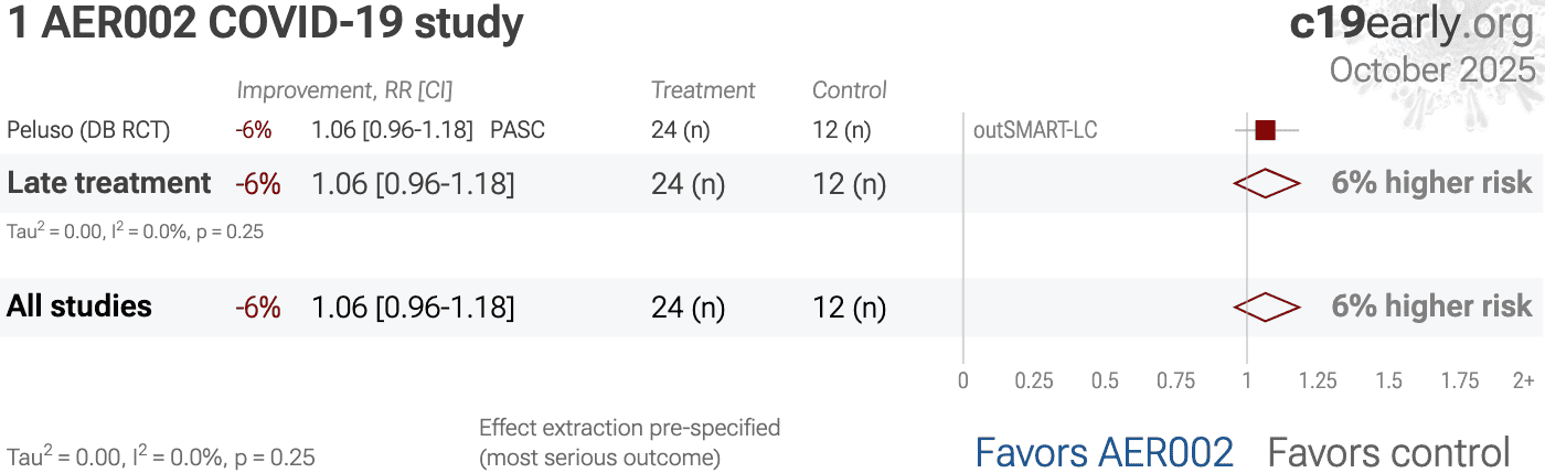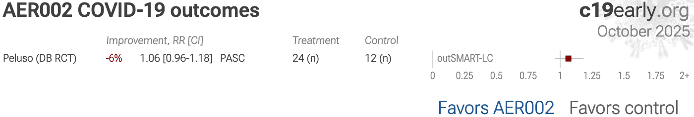 | 6% higher PASC (p=0.25). RCT 36 patients showing no improvement in long COVID with AER002. | ||