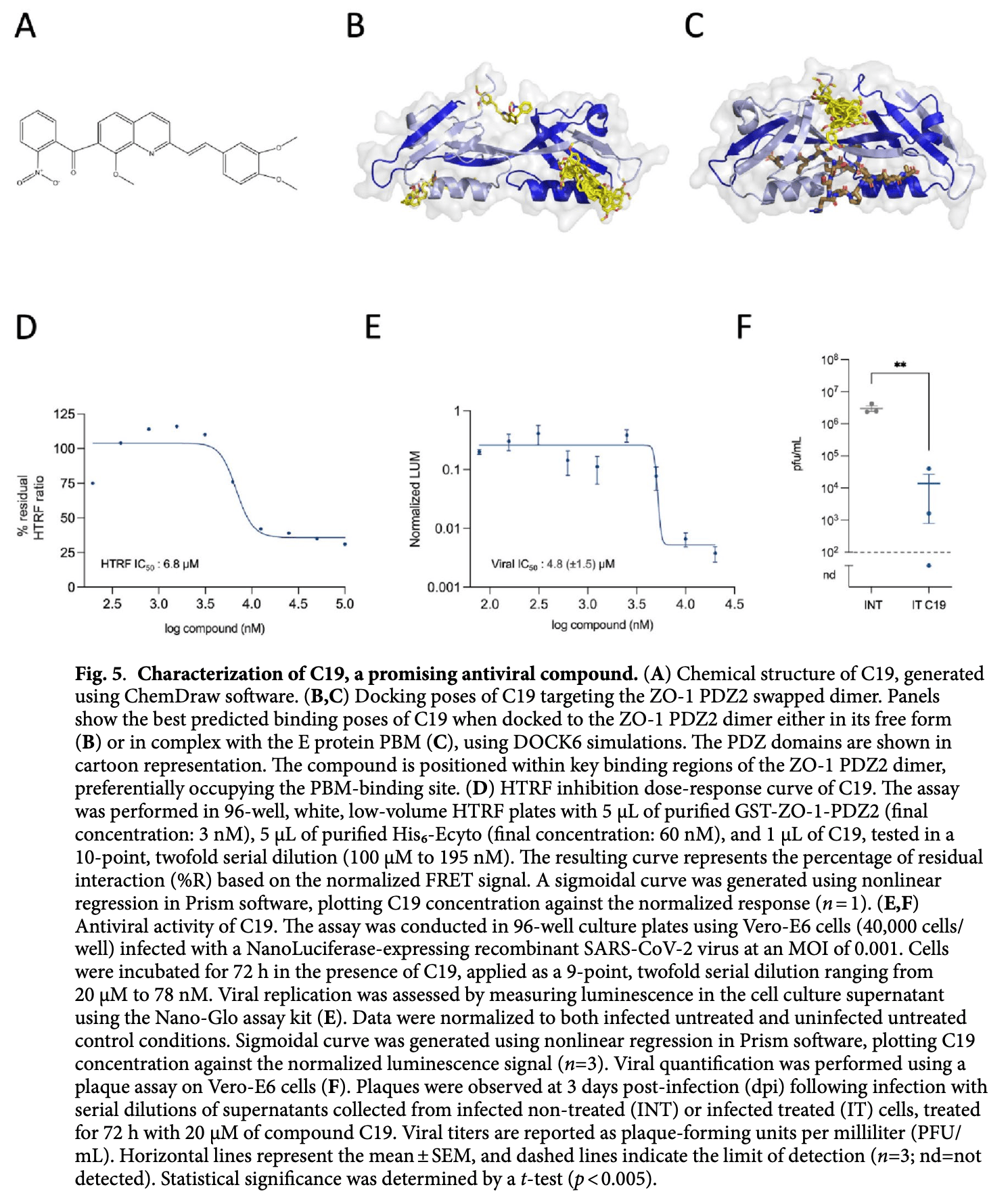 In vitro study showing that compound C19 significantly reduces SARS-CoV-2 replication by targeting the interaction between viral E protein and host ZO-1 PDZ2 domain.
