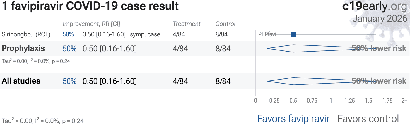 0 0.25 0.5 0.75 1 1.25 1.5 1.75 2+ Ruzhentsova (RCT) 6% 0.94 [0.78-1.14] hosp. 3/112 2/56 Improvement, RR [CI] Treatment Control Udwadia (RCT) 66% 0.34 [0.01-8.12] death 0/73 1/75 Sawanpanyalert 68% 0.32 [0.15-0.66] progression n/a n/a Holubar (DB RCT) 89% 0.11 [0.01-2.02] hosp. 0/75 4/74 Alattar (PSM) 33% 0.67 [0.28-1.61] death 8/387 12/387 Bosaeed (DB RCT) -619% 7.19 [0.38-138] ICU 3/112 0/119 FLARE Lowe (DB RCT) -202% 3.02 [0.13-72.6] ICU 1/59 0/60 Adhikari (RCT) -40% 1.40 [0.57-3.44] no improv. 10/38 6/32 Tsuzuki 13% 0.87 [0.52-1.46] death 2,532 (n) 5,122 (n) Qadir 97% 0.03 [0.00-0.47] death 0/125 17/125 Usanma Koban 86% 0.14 [0.02-0.70] viral+ 47 (n) 79 (n) Sirijatuphat (RCT) 64% 0.36 [0.20-0.64] improv. 62 (n) 31 (n) McMahon (RCT) -1% 1.01 [0.34-3.03] oxygen 6/99 6/100 PRESECO Golan (DB RCT) 67% 0.33 [0.01-8.12] death 0/599 1/588 Bruminhent -227% 3.27 [1.43-7.50] progression n/a n/a Chandiwana (RCT) -13% 1.13 [0.23-5.46] progression 37 (n) 39 (n) CT​2 Vaezi (DB RCT) -105% 2.05 [0.40-10.6] hosp. 4/38 2/39 PLATCOV Luvira (RCT) -6% 1.06 [0.93-1.21] viral rate 116 (n) 132 (n) Lokanuwatsatien 14% 0.86 [0.64-1.17] PASC 400 (n) 402 (n) Iwata (DB RCT) -16% 1.16 [0.45-2.21] oxygen 12/43 12/43 FaviPrev Siripongboonsitti 25% 0.75 [0.51-0.97] transmission 1,064/1,836 122/170 GETAFIX Tate (RCT) 34% 0.66 [0.11-3.88] hosp. 2/152 3/150 Tau​2 = 0.09, I​2 = 65.1%, p = 0.094 Early treatment 18% 0.82 [0.65-1.03] 1,113/6,942 188/7,823 18% lower risk Cai 69% 0.31 [0.10-0.96] pneumonia 35 (n) 45 (n) Improvement, RR [CI] Treatment Control Ivashchenko (RCT) -300% 4.00 [0.20-79.6] death 2/40 0/20 Lou (RCT) -422% 5.22 [0.28-96.2] ICU 2/9 0/10 Pushkar (RCT) 14% 0.86 [0.73-1.00] no recov. 73/100 85/100 Khamis (RCT) 15% 0.85 [0.28-2.59] death 5/44 6/45 OT​1 CT​2 Solaymani.. (RCT) -19% 1.19 [0.70-2.04] death 26/190 21/183 OT​1 Zhao (RCT) 59% 0.41 [0.16-1.03] viral+ 7/36 9/19 Kokturk -84% 1.84 [0.60-5.36] death 39/328 28/1,172 Haji Aghajani 26% 0.74 [0.43-1.27] death 40 (n) 951 (n) Alamer -56% 1.56 [0.73-3.36] death 12/233 21/223 Almoosa -42% 1.42 [0.90-2.25] death 33/110 24/116 Shinkai (SB RCT) 37% 0.63 [0.40-0.98] imp. time 107 (n) 49 (n) Assiri (ICU) -79% 1.79 [0.33-8.02] death 11/67 3/51 ICU patients Kulzhanova 88% 0.12 [0.04-0.37] no improv. 3/40 25/40 Chen (RCT) -3% 1.03 [0.15-7.22] ICU 2/116 2/120 OT​1 Alotaibi 57% 0.43 [0.18-1.01] death 244 (n) 193 (n) OT​1 Tabarsi (RCT) 30% 0.70 [0.17-2.88] death 3/32 4/30 OT​1 FIGHT-COVID-19 Atipornwa.. (RCT) 23% 0.77 [0.35-1.67] death 10/100 13/100 OT​1 CT​2 Damayanti 54% 0.46 [0.22-0.92] no recov. 96 (n) 96 (n) Shenoy (DB RCT) -29% 1.29 [0.60-2.77] death 14/175 11/178 Chuah (RCT) -1154% 12.54 [0.76-208] death 5/250 0/250 Finberg (RCT) -200% 3.00 [0.13-70.3] death 1/25 0/25 Al Mutair (ICU) 7% 0.93 [0.77-1.12] death 119/269 128/269 ICU patients OT​1 Kurniyanto 48% 0.52 [0.22-1.25] death 10/325 9/152 Cilli 38% 0.62 [0.24-1.63] death 5/23 8/23 Al-Muhsen -263% 3.63 [1.06-12.4] death 156 (n) 442 (n) Yulia 85% 0.15 [0.02-1.02] death 432 (all patients) Uyaroğlu (PSM) 67% 0.33 [0.01-7.96] death 0/42 1/42 OT​1 AlQahtani (RCT) -196% 2.96 [0.12-71.1] death 1/54 0/52 Shinada 7% 0.93 [0.45-1.89] hosp. 17 (n) 17 (n) Hassaniazad (RCT) 68% 0.32 [0.07-1.48] death 2/32 6/31 OT​1 Hafez -3% 1.03 [0.68-1.56] viral+ 59 (n) 1,446 (n) CT​2 Rahman (DB RCT) 89% 0.11 [0.01-0.75] no improv. 1/19 8/16 Tehrani (RCT) 34% 0.66 [0.34-1.26] hosp. 10/38 16/40 Abdulrahman (ICU) 3% 0.97 [0.81-1.18] death 74/193 593/1,506 ICU patients Acar Sevinc (ICU) 16% 0.84 [0.62-1.12] death 57/85 12/15 ICU patients OT​1 Tawfik 96% 0.04 [0.00-0.26] death 1/103 17/62 Babayigit -184% 2.84 [1.27-6.14] ventilation 47/325 17/977 Behboodikhah 68% 0.32 [0.05-1.83] death 95 (n) 2,079 (n) PIONEER Shah (RCT) 26% 0.74 [0.44-1.23] death 26/251 34/248 Alosaimi (PSM) 80% 0.20 [0.01-4.03] death 0/37 2/37 OT​1 Delen 23% 0.77 [0.19-3.20] ICU 3/34 4/35 Hartantri 76% 0.24 [0.11-0.54] death n/a n/a Alshamrani (PSM) -14% 1.14 [0.96-1.35] death 326/1,159 316/1,380 Arfijanto 51% 0.49 [0.26-0.94] viral+ 8/37 55/125 Sulaiman (ICU) -17% 1.17 [0.73-1.87] death 73 (n) 73 (n) ICU patients Shamsi 96% 0.04 [0.00-3.01] death 0/19 24/164 FAVID Horcajada (DB RCT) -383% 4.83 [0.24-95.1] death 2/23 0/21 Alsaraj (RCT) -87% 1.87 [0.67-5.21] death 9/51 5/53 Saito -168% 2.68 [0.96-7.48] death 7/40 6/92 PRINCIPLE Hobbs (RCT) 86% 0.14 [0.01-2.65] death 0/1,829 3/1,668 Abdulaziz -149% 2.49 [1.12-5.51] misc. 57 (n) 179 (n) Lumkul 4% 0.96 [0.93-0.99] death 828 (n) 109 (n) Tau​2 = 0.02, I​2 = 67.9%, p = 0.1 Late treatment 7% 0.93 [0.84-1.02] 956/8,690 1,516/15,369 7% lower risk PEPfavi Siripongbo.. (RCT) 50% 0.50 [0.16-1.60] symp. case 4/84 8/84 Improvement, RR [CI] Treatment Control Tau​2 = 0.00, I​2 = 0.0%, p = 0.24 Prophylaxis 50% 0.50 [0.16-1.60] 4/84 8/84 50% lower risk All studies 10% 0.90 [0.82-0.97] 2,073/15,716 1,712/23,276 10% lower risk 76 favipiravir COVID-19 studies c19early.org January 2026 Tau​2 = 0.03, I​2 = 68.5%, p = 0.01 Effect extraction pre-specified(most serious outcome, see appendix) 1 OT: comparison with other treatment2 CT: study uses combined treatment Favors favipiravir Favors control
