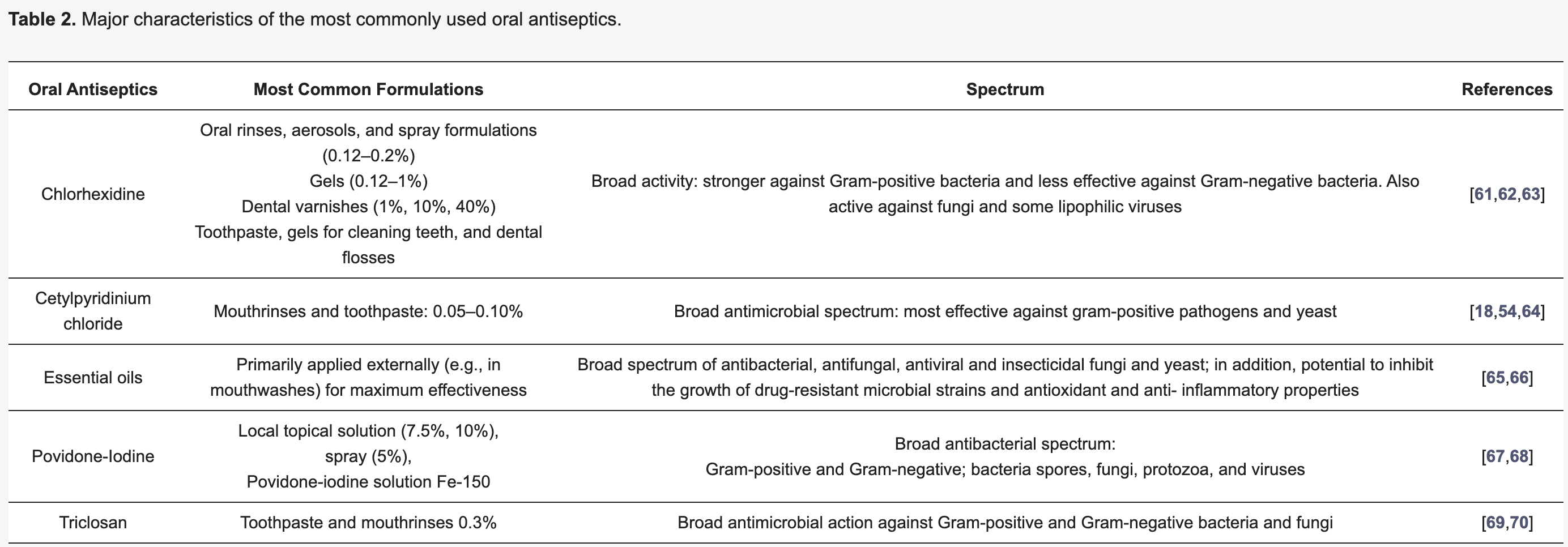 Review of oral antiseptic formulations and their effects on oral microbiota and systemic diseases. While antiseptics like chlorhexidine, essential oils, povidone-iodine, and cetylpyridinium chloride can effectively reduce pathogenic oral microorganisms and improve periodontal health, they may also disrupt beneficial commensal bacteria, potentially leading to oral dysbiosis.