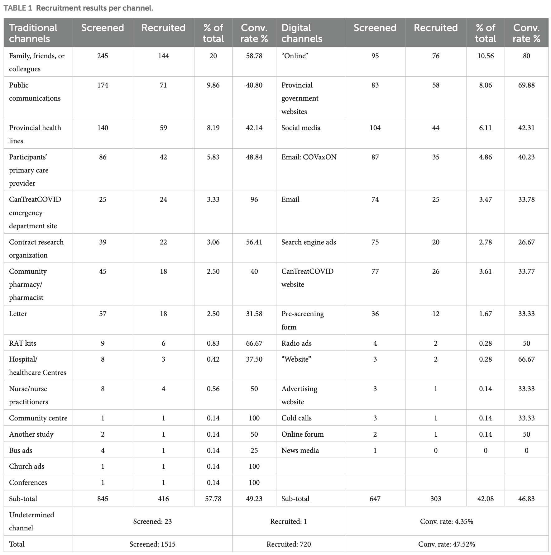 Frontiers in Public Health 07 frontiersin.org The increased utilization of online platforms during the COVID-19 pandemic introduced affordances for mixed traditional and digital recruitment in trials (13, 24) . While leveraging various channels reaches broad audiences, understanding geographical and other relevant contexts is equally important for successful recruitment (22, 23) . The observed variation in traditional and digital recruitment channel distribution across CanTreatCOVID sites aligns with the moderate association identified in the analysis. Two of the provinces that generated 77% of the recruitment results had different primary sources: traditional for ON and digital for BC, whereas other sites relied on traditional channels. The heterogeneity across provinces suggests that geographical and other characteristics influence recruitment rather than uniform reliance on a single recruitment strategy, and highlights the potential complementary role of traditional and digital channels. A key limitation of this analysis is that recruitment strategies were not randomized, and participants may have been exposed to multiple recruitment channels. As a result, the findings should be interpreted as descriptive comparisons and associations rather than causal or inferential effects of specific recruitment approaches. This study reports on a wide range of recruitment channels and provides insights into their effectiveness in engaging with potential participants. Future..