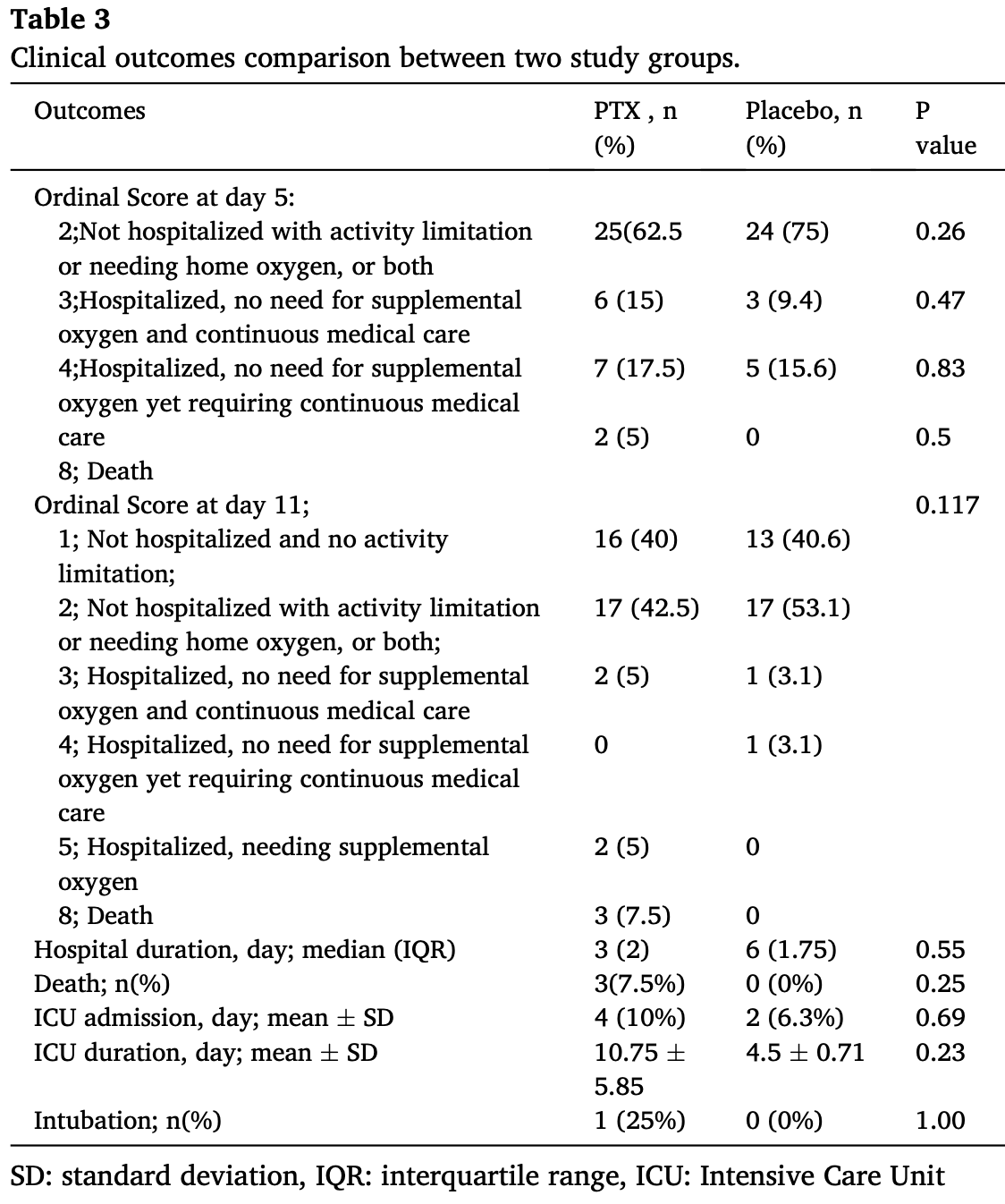 RCT 72 hospitalized COVID-19 patients showing no significant difference in clinical outcomes with pentoxifylline treatment compared to placebo.