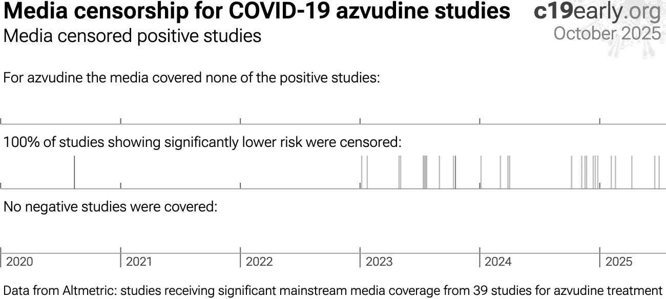 0 0.25 0.5 0.75 1 1.25 1.5 1.75 2+ Chen -12% 1.12 [0.05-23.9] recov. time 66 (n) 41 (n) Improvement, RR [CI] Treatment Control Han (PSM) 37% 0.63 [0.40-1.00] death 428 (n) 428 (n) Yang 91% 0.09 [0.01-1.62] death 0/317 6/487 Wang 20% 0.80 [0.46-1.40] death 128 (n) 55 (n) Jin -1% 1.01 [0.91-1.12] recov. time 33 (n) 33 (n) Wu (PSM) 81% 0.19 [0.07-0.50] death 90 (n) 90 (n) Zou 9% 0.91 [0.54-1.53] viral+ 14/91 96/569 Guo (PSM) 56% 0.44 [0.25-0.78] death 703 (n) 703 (n) Tau​2 = 0.16, I​2 = 71.7%, p = 0.021 Early treatment 36% 0.64 [0.44-0.94] 14/1,856 102/2,406 36% lower risk Ren (RCT) 38% 0.62 [0.40-0.98] recov. time 10 (n) 10 (n) Improvement, RR [CI] Treatment Control Shen (PSM) 74% 0.26 [0.07-0.94] death 3/226 10/226 Chen (PSM) 6% 0.94 [0.61-1.43] death 29/99 31/99 Sun 54% 0.46 [0.15-1.34] death 5/245 9/245 Zong (PSM) 62% 0.38 [0.23-0.62] death 195 (n) 390 (n) Shao 56% 0.44 [0.24-0.79] death 177 (n) 509 (n) Dian (PSM) 64% 0.36 [0.12-1.13] death 4/228 11/228 OT​1 Zhou 22% 0.78 [0.56-1.09] death 37/131 69/191 Wei -0% 1.00 [0.68-1.47] death 63/461 36/264 OT​1 de Souza (DB RCT) 27% 0.73 [0.17-3.15] ICU 3/91 4/88 Liu 24% 0.76 [0.42-1.37] progression 12/126 56/446 Li (PSM) 29% 0.71 [0.52-0.97] death 1,103 (n) 1,103 (n) Peng -13% 1.13 [0.32-3.99] death 42 (n) 124 (n) Li 50% 0.50 [0.10-2.58] ICU 2/42 4/42 Zhong (PSW) 35% 0.65 [0.42-1.00] death 1,490 (n) 1,373 (n) Liu (PSM) 45% 0.55 [0.15-1.96] progression 148 (all patients) Lv -42% 1.42 [0.39-5.15] death 2/11 40/313 Zhang -32% 1.32 [0.89-1.97] death 49/303 37/303 Xu (PSM) 75% 0.25 [0.08-0.81] death 132 (n) 132 (n) Ren (PSM) 32% 0.68 [0.60-0.78] death 5,735 (n) 5,735 (n) Zhang 43% 0.57 [0.35-0.95] progression 28/165 13/44 Zhu (PSM) 22% 0.78 [0.67-0.90] death 265/1,999 341/1,999 Yuan 9% 0.91 [0.83-0.99] viral time 121 (n) 123 (n) Zhong (PSW) 35% 0.65 [0.42-1.00] death 1,490 (n) 1,372 (n) Sun (PSM) 27% 0.73 [0.55-0.96] death 1,462 (n) 1,462 (n) Zhou (PSM) 26% 0.74 [0.58-0.94] death 1,417 (n) 1,417 (n) He -48% 1.48 [1.23-1.78] death 165/865 214/1,655 Yu (PSM) 38% 0.62 [0.48-0.77] death 831 (n) 831 (n) Zhang (PSM) 20% 0.80 [0.70-0.92] hosp. time 48 (n) 48 (n) Wang 45% 0.55 [0.30-1.00] death 302 (n) 302 (n) Han (PSM) 27% 0.73 [0.57-0.94] death 90/901 123/901 Tau​2 = 0.05, I​2 = 70.0%, p < 0.0001 Late treatment 25% 0.75 [0.67-0.83] 757/20,448 998/21,975 25% lower risk All studies 26% 0.74 [0.67-0.82] 771/22,304 1,100/24,381 26% lower risk 39 azvudine COVID-19 studies c19early.org October 2025 Tau​2 = 0.05, I​2 = 71.1%, p < 0.0001 Effect extraction pre-specified(most serious outcome, see appendix) 1 OT: comparison with other treatment Favors azvudine Favors control
