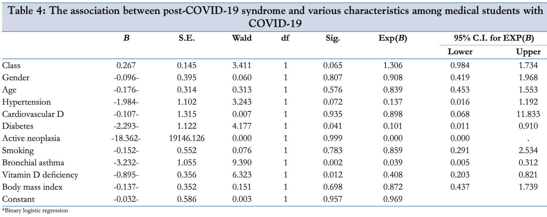 "abstract": "<jats:title>A<jats:sc>BSTRACT</jats:sc>\n </jats:title>\n <jats:sec>\n <jats:title>Background:</jats:title>\n <jats:p>COVID-19 has infected 221 million individuals worldwide and new strains are discovered continuously. An important complication is the post-COVID-19 syndrome that affects various organs with substantial morbidities. Studies on post-COVID-19 symptoms and risk factors are scarce. We aimed to assess the same among medical students at the University of Tabuk, Saudi Arabia.</jats:p>\n </jats:sec>\n <jats:sec>\n <jats:title>Methodology:</jats:title>\n <jats:p>This cross-sectional study was conducted among 424 medical students at the University of Tabuk, Saudi Arabia, during the period from July 2023 to October 2024. A web-based questionnaire detailing the demographic factors, post-COVID-19 symptoms, comorbidities, vitamin D deficiency, and the cumulative grade average (GPA) was used.</jats:p>\n </jats:sec>\n <jats:sec>\n <jats:title>Results:</jats:title>\n <jats:p>Out of the 424 students, 38.2% were overweight and 9.4% were obese, 26.9% had bronchial asthma, and diabetes was found in 11.8%. Smoking was observed in 25%, and 58.5% were vitamin D deficient, while 22.6% were hospitalized with COVID-19. The majority of students received > two doses (74.1%), 24.5% received two doses, and 1.4% received one dose. The majority (80.7%) of students reported at least one post-COVID-19 symptom, and headache was the commonest symptom (63.7%), followed by cough in 50.5%. The absence from classrooms was 54.2%, 32.1%, and 13.7% (3 days, 3-8 days, and >10 days/month, respectively), and 44.8% thought that long COVID-19 negatively affected their GPA.</jats:p>\n </jats:sec>\n <jats:sec>\n <jats:title>Conclusion:</jats:title>\n <jats:p>Post-COVID-19 syndrome was associated with diabetes, bronchial asthma, and vitamin D deficiency, odd ratios, 95% <jats:italic toggle=\"yes\">CI</jats:italic>, 0.011-0.910, 0.005-0.312, 0.203-0.821, respectively, <jats:italic toggle=\"yes\">P</jats:italic> values > 0.05. No significant association was found regarding, age, gender, and smoking, <jats:italic toggle=\"yes\">P</jats:italic> values >0.05.</jats:p>\n </jats:sec>",