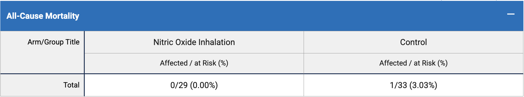 Early terminated RCT 62 hosptialized patients, showing no significant difference with nitric oxide treatment.