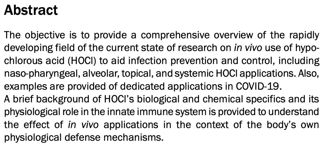 "abstract": "The objective is to provide a comprehensive overview of the rapidly developing field of the current state of research on in vivo use of hypochlorous acid (HOCl) to aid infection prevention and control, including naso-pharyngeal, alveolar, topical, and systemic HOCl applications. Also, examples are provided of dedicated applications in COVID-19. A brief background of HOCl’s biological and chemical specifics and its physiological role in the innate immune system is provided to understand the effect of in vivo applications in the context of the body’s own physiological defense mechanisms.",