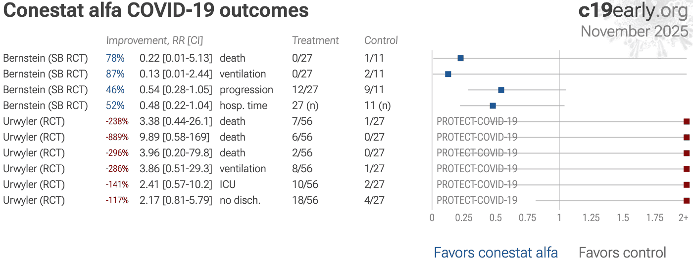 | 78% lower mortality (p=0.29), 87% lower ventilation (p=0.08), 46% lower progression (p=0.07), and 52% shorter hospitalization (p=0.06). RCT 38 hospitalized COVID-19 patients showing non-significant improvements with conestat alfa. Results of this manufacturer RCT are notably better than the non-manufacturer RCT [Urwyler]. | ||