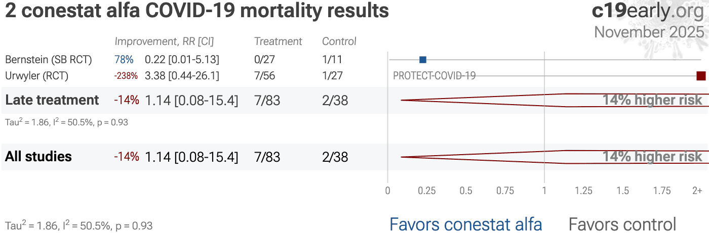 | 238% higher mortality (p=0.26), 286% higher ventilation (p=0.26), 141% higher ICU admission (p=0.32), and 117% lower hospital discharge (p=0.12). RCT 84 hospitalized COVID-19 patients showing higher mortality with conestat alfa (recombinant C1 inhibitor), without reaching statistical significance. | ||