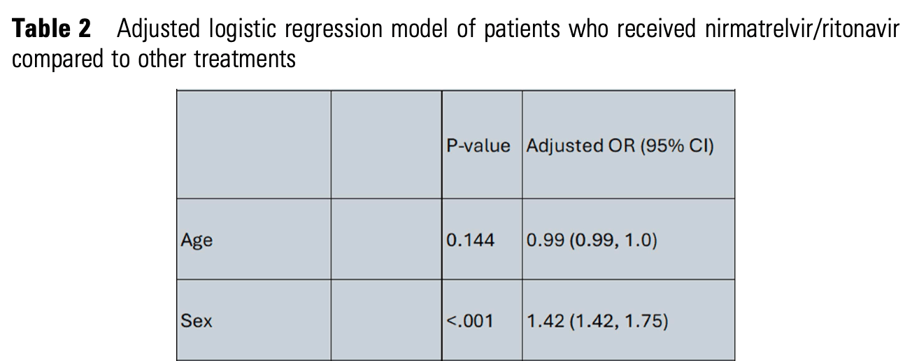"abstract": "<jats:title>Abstract</jats:title>\n <jats:sec>\n <jats:title>Background</jats:title>\n <jats:p>COVID-19 has caused significant morbidity and mortality which disproportionately impacted racial and ethnic minorities. The introduction of nirmatrelvir/ritonavir (n/r) has introduced an oral option for treatment, but its use was limited by drug-drug interactions. In this study, we aim to evaluate the factors associated with the prescription of nirmatrelvir/ritonavir (n/r) compared to other COVID-19 antivirals in a healthcare system in Eastern Massachusetts.Table 1Baseline demographic and clinical characteristics of patients who received nirmatrelvir/ritonavir compared to other treatmentsTable 2Adjusted logistic regression model of patients who received nirmatrelvir/ritonavir compared to other treatments</jats:p>\n </jats:sec>\n <jats:sec>\n <jats:title>Methods</jats:title>\n <jats:p>This is a retrospective study including adult patients with a COVID-19 diagnosis. The Vizient Clinical Database, which captures patient-level data, was used to identify encounters between Oct/2022 and Jul/2024. The primary study outcome was evaluating patients who received COVID-19 antivirals with molnupiravir, remdesivir or combination of multiple agents compared to those who received n/r. Demographic data including Vizent vulnerability index (VVI) were collected. VVI score ranges between -3 to 3, higher values indicates increased vulnerability. Patient characteristics by treatment group were presented as counts and percentages for categorical variables and medians with interquartile ranges for continuous variables. The primary analysis was a logistic regression model evaluating factors associated with n/r prescription.</jats:p>\n </jats:sec>\n <jats:sec>\n <jats:title>Results</jats:title>\n <jats:p>We identified 3498 who received COVID-19 antivirals. Most patients received n/r for treatment (n = 2106, 60.2%). Patients’ characteristics are outlined in Table 1. In the multivariate model female sex, outpatient encounters, higher VVI (more socially vulnerable) and non-White race remained significantly associated with increased odds of being prescribed n/r (Table 2). Inpatient encounter and Medicare coverage were associated with reduced odds of getting n/r as compared to patients seen in the ED.</jats:p>\n </jats:sec>\n <jats:sec>\n <jats:title>Conclusion</jats:title>\n <jats:p>Prescriptions for n/r is different across the healthcare system. N/r was found to be prescribed more in the outpatient and ED setting which is unsurprising based upon its oral dosage form. However, patients with lower socioeconomic status based upon the VVI and non-White were more likely to be prescribed n/r. These findings highlight demographic and socioeconomic differences in the prescribing patterns of COVID-19 antiviral therapies.</jats:p>\n </jats:sec>\n <jats:sec>\n <jats:title>Disclosures</jats:title>\n <jats:p>All Authors: No reported disclosures</jats:p>\n </jats:sec>",