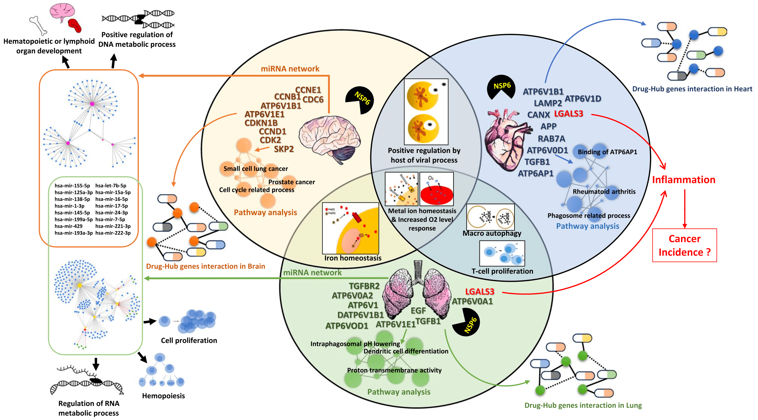 "title": "Pathways in the brain, heart and lung influenced by SARS-CoV-2 NSP6 and SARS-CoV-2 regulated miRNAs: an in silico study hinting cancer incidence",