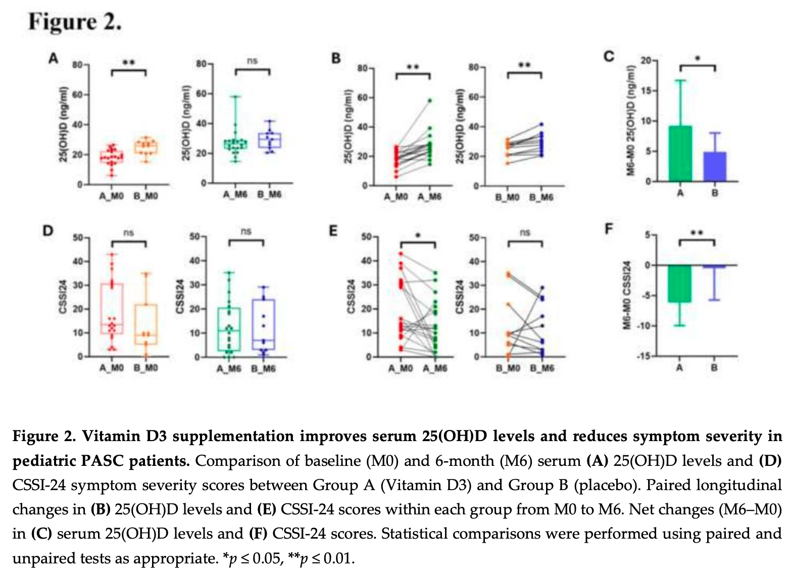 "abstract": "<jats:p>Background :Post-acute sequelae of COVID-19 (PASC) in children present persistent symptoms that impair quality of life. Vitamin D’s immunomodulatory and microbiome-modulating properties suggest its potential to alleviate PASC symptoms. This study evaluated the efficacy of Vitamin D3 supplementation in alleviating symptom severity and to explore associated immunological and microbiome alterations in children with PASC. Methods: In a double-blind randomized controlled clinical trial, 33 children with PASC were assigned to receive 2,000 IU/day of oral vitamin D (Group A, n=21) or placebo (Group B, n=12) for 6 months. Serum 25-hydroxyvitamin D [25(OH)D] levels, symptom severity (Children’s Somatic Symptom Inventory-24, CSSI-24), immune cytokines, and checkpoint proteins were assessed at baseline (M0) and 6 months (M6). Nasal and rectal microbiota were analyzed using 16S rRNA sequencing to evaluate composition and predict functional pathways. Results: Serum 25(OH)D increased significantly in Group A compared with Group B (p &lt; 0.01). Group A demonstrated significant reductions in CSSI-24 scores (p &lt; 0.05), with improvements in neuropsychiatric, respiratory and cardiovascular symptoms. Pro-inflammatory cytokines including IFN-γ (FDR = 0.01) and MIP-1α (FDR = 0.0004) decreased, while checkpoint proteins TIM-3 and HVEM increased (both FDR &lt; 0.05). Nasal microbiota in Group A at M6 showed increased richness and enrichment of Sphingomonas, Paenibacillus, Ralstonia, and Sphingobium, with functional pathways related to xenobiotic metabolism altered after supplementation. Coprobacillus abundance in rectal samples positively correlated with 25(OH)D levels and negatively with IFN-γ (p = 0.02). Pooling participants from both time points across group A indicated that higher 25(OH)D levels were associated with lower symptom scores. Conclusions: Vitamin D3 supplementation improved symptom severity, modulated immune responses, and altered microbiota profiles in children with PASC. These findings support Vitamin D3 as a potential adjunctive therapy for pediatric PASC and highlight host–microbe–immune interactions as therapeutic targets.</jats:p>",