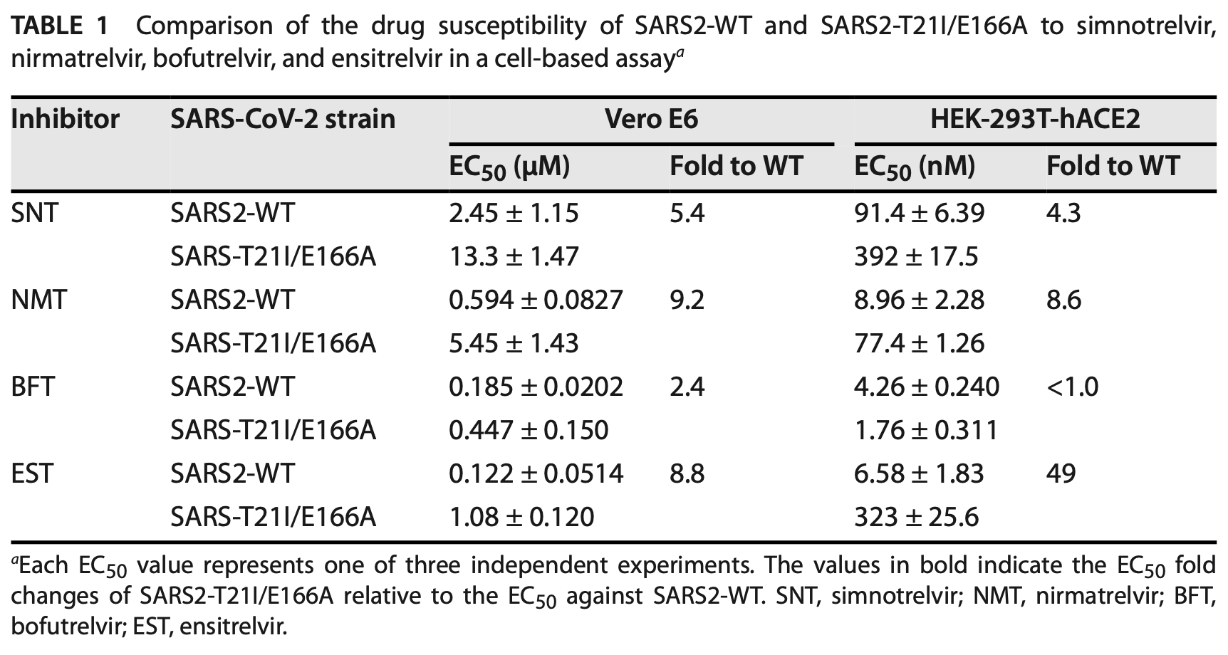 In vitro and mouse study showing differential resistance of SARS-CoV-2 3CLpro T21I/E166A mutations to simnotrelvir, bofutrelvir, nirmatrelvir, and ensitrelvir.