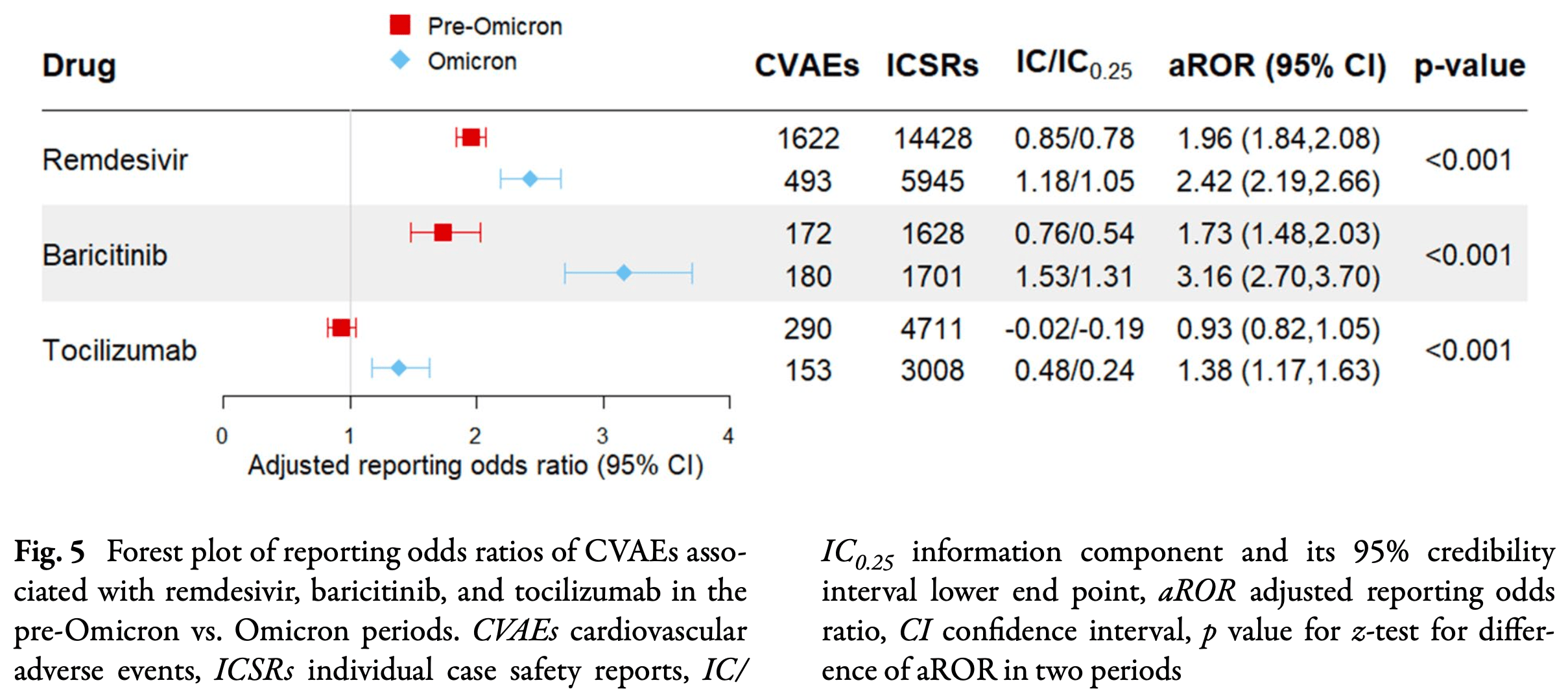 Retrospective disproportionality analysis of 276,631 COVID-19 adverse event reports from the WHO VigiBase database showing that remdesivir and baricitinib were associated with 2.4-fold and 2.3-fold increased odds of cardiovascular adverse events, and that cardiovascular adverse events were unexpectedly higher for Omicron compared to pre-Omicron variants for remdesivir, baricitinib, and tocilizumab.