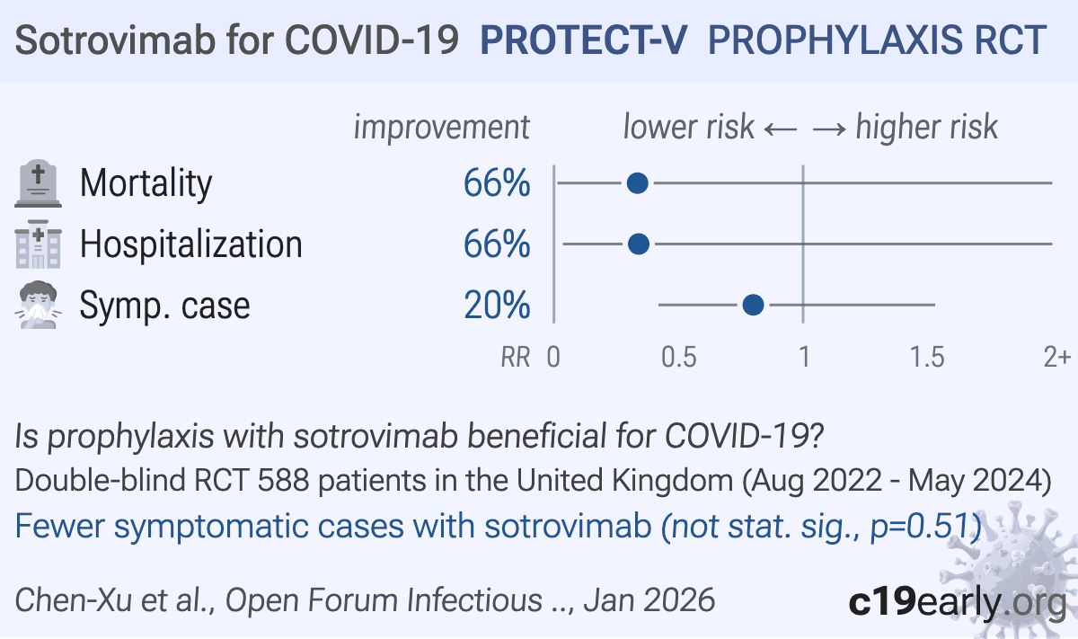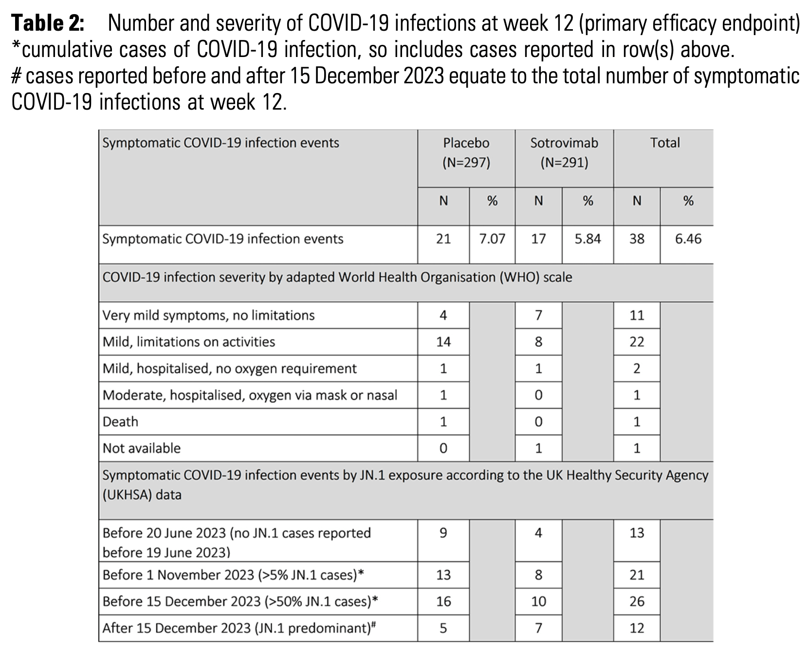 RCT 619 vulnerable patients showing no significant difference in symptomatic COVID-19 infections at 12 weeks with sotrovimab pre-exposure prophylaxis.