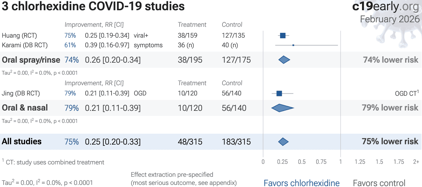 0 0.25 0.5 0.75 1 1.25 1.5 1.75 2+ Bonn (DB RCT) 85% viral- Short term viral CT​1 Improvement Relative Risk [CI] Jing (DB RCT) 79% OGD OGD CT​1 Sulistyani 54% viral- Tau​2 = 0.17, I​2 = 53.0%, p = 0.00063 Early treatment 69% 69% lower risk Huang (RCT) 75% viral- Tau​2 = 0.00, I​2 = 0.0%, p < 0.0001 Late treatment 75% 75% lower risk Karami (DB RCT) 61% symptoms Tau​2 = 0.00, I​2 = 0.0%, p = 0.041 Prophylaxis 61% 61% lower risk All studies 70% 70% lower risk 5 chlorhexidine C19 studies c19early.org February 2026 Tau​2 = 0.05, I​2 = 36.5%, p < 0.0001 Protocol pre-specified/rotate for details1 CT: study uses combined treatment Favors chlorhexidine Favors control