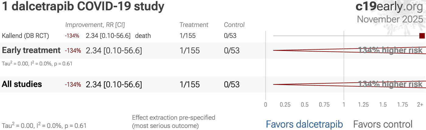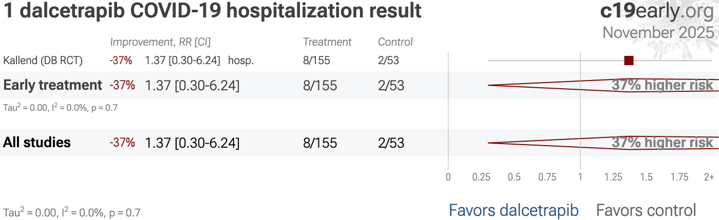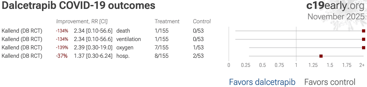 | 134% higher mortality (p=1), 134% higher ventilation (p=1), 139% higher need for oxygen therapy (p=0.68), and 37% higher hospitalization (p=1). RCT 227 COVID-19 outpatients with symptom onset within 5 days, showing no signficiant benefits with dalcetrapib treatment. | ||