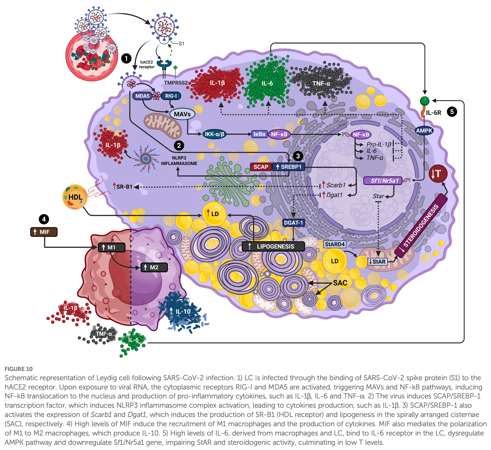 "abstract": "<jats:sec>\n <jats:title>Background</jats:title>\n <jats:p>During COVID-19 pandemic, men had reduced serum testosterone and higher mortality rate than women. Variations in high density lipoprotein (HDL) levels were detected in severe COVID-19 individuals. We evaluated the response of testicular macrophages, steroidogenic activity and lipid metabolism of Leydig cells in SARS-CoV-2-infected K18-hACE2 mice.</jats:p>\n </jats:sec>\n <jats:sec>\n <jats:title>Methods</jats:title>\n <jats:p>\n Testes were analyzed under light and electron microscope. Immunolocalization of human angiotensin converting enzyme (hACE2) and viral proteins (spike and nucleocapsid) were evaluated in association with the expression of viral recognition receptor\n <jats:italic>, Rigi</jats:italic>\n . Steroidogenesis was evaluated by the expression of\n <jats:italic>steroidogenic factor-1</jats:italic>\n (\n <jats:italic>Sf1</jats:italic>\n ), and the immunolocalization of steroidogenic proteins and testosterone. Pro-inflammatory (TNF-α, IL-1β, IL-6), anti-inflammatory (IL-10) cytokines, macrophages (CD68 and CD163) and macrophage inhibitory factor (MIF) were detected by immunolocalization and Western blot. The expression of lipid metabolism genes (\n <jats:italic>Srebp, Dgat1 and Scarb1</jats:italic>\n ) were investigated by RT-qPCR.\n </jats:p>\n </jats:sec>\n <jats:sec>\n <jats:title>Results</jats:title>\n <jats:p>\n In the infected animals, the Leydig cells showed enhanced immunolocalization of hACE2, spike and nucleocapsid. The expression of\n <jats:italic>Rigi</jats:italic>\n , pro-inflammatory cytokines and number of macrophages increased, confirming viral infection.\n <jats:italic>Sf1</jats:italic>\n expression, steroidogenic proteins and testosterone were reduced whereas the expression of\n <jats:italic>Dgat1, Srebp and Scarb1</jats:italic>\n increased. Lipid droplets-enriched Leydig cells and viral particles in lipids were observed. The infected Leydig cells also showed enhanced pro-inflammatory cytokines immunolabeling.\n </jats:p>\n </jats:sec>\n <jats:sec>\n <jats:title>Conclusion</jats:title>\n <jats:p>SARS-CoV-2 infects Leydig cells, activates its immune response and impairs steroidogenesis. The virus uses the steroidogenic machinery and induces lipid metabolism pathways for its survival and replication in these cells. These findings support the low testosterone and HDL levels in men with severe COVID-19.</jats:p>\n </jats:sec>",
