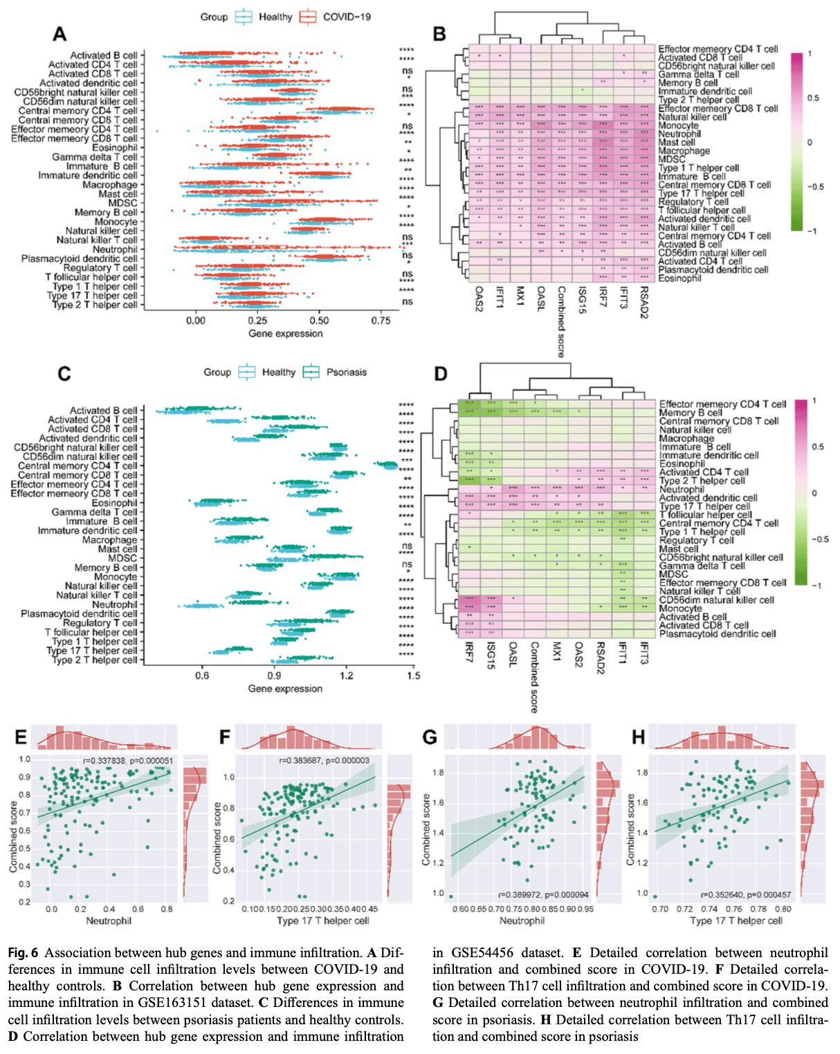 In silico study showing shared molecular mechanisms between COVID-19 and psoriasis through transcriptomic analysis. Authors identified 66 common upregulated genes between the two conditions, with eight hub genes (OAS2, MX1, IRF7, RSAD2, OASL, IFIT1, IFIT3, and ISG15) showing high diagnostic accuracy (AUC >0.7 for COVID-19, AUC >0.9 for psoriasis).