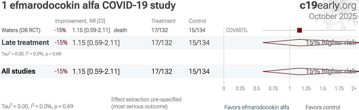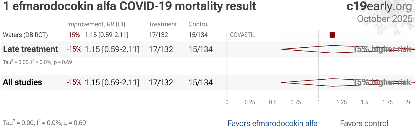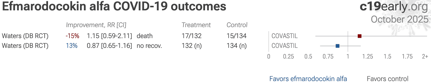| 15% higher mortality (p=0.67) and 13% improved recovery (p=0.35). RCT 396 hospitalized patients with severe COVID-19 pneumonia showing no significant difference in time to recovery with astegolimab (IL-33 receptor blocker) or efmarodocokin alfa (IL-22 pathway activator). Median time to recovery was 11 d.. | ||