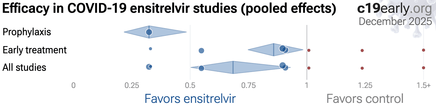 0 0.25 0.5 0.75 1 1.25 1.5 1.75 2+ Mukae (DB RCT) 45% viral- Improvement Relative Risk [CI] Mukae (DB RCT) 9% improv. SCORPIO-SR Yotsuya.. (DB RCT) -1% hospitalization Takazono (PSW) -24% death SCORPIO-HR Luetke.. (DB RCT) -203% hospitalization Katsuta 10% recovery PLATCOV Schilling (RCT) 67% hospitalization Tau​2 = 0.01, I​2 = 21.0%, p = 0.028 Early treatment 14% 14% lower risk SCORPIO-PEP Hayden (DB RCT) 68% symp. case Tau​2 = 0.00, I​2 = 0.0%, p < 0.0001 Prophylaxis 68% 68% lower risk All studies 32% 32% lower risk 8 ensitrelvir C19 studies c19early.org December 2025 Tau​2 = 0.09, I​2 = 76.9%, p = 0.015 Effect extraction pre-specifiedRotate device for details Favors ensitrelvir Favors control