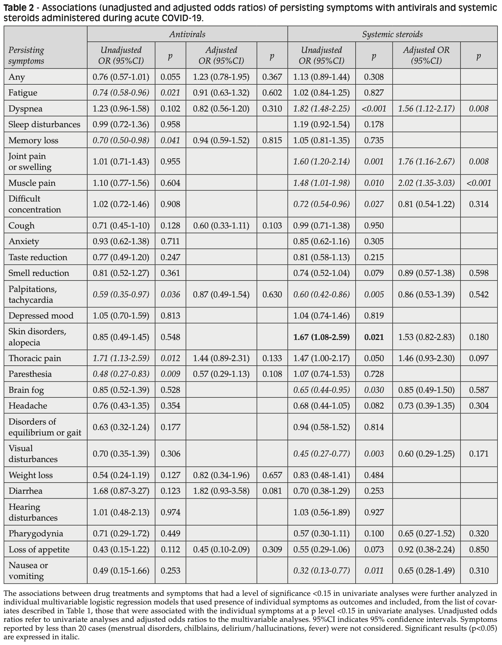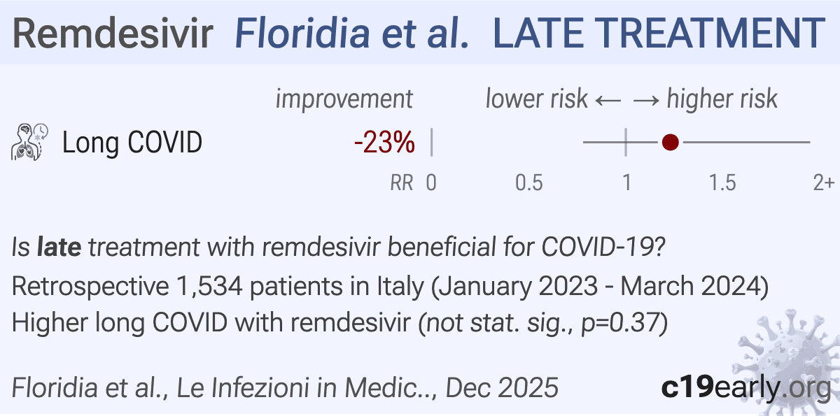 Retrospective 1,534 patients (67% hospitalized) accessing long-COVID centers in Italy showing higher persistent long-COVID symptoms with antiviral treatment (97% remdesivir) after adjustment for confounders, without statistical significance. The mean interval between acute SARS-CoV-2 infection and symptom evaluation was of 338 days.
