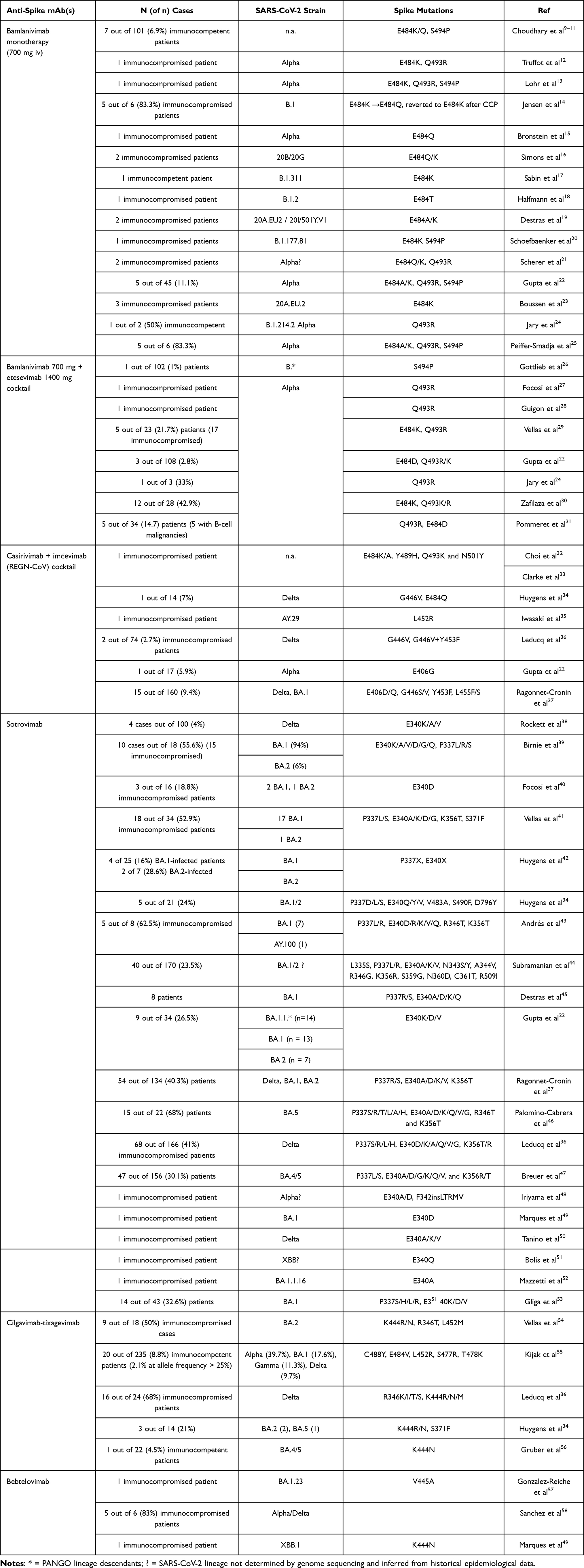 Focosi, Mcconnell, Sullivan, Casadevall, Analysis of SARS-CoV-2 mutations associated with resistance to therapeutic monoclonal antibodies that emerge after treatment. Drug resistance updates: reviews and commentaries in antimicrobial and anticancer chemotherapy, Drug Resist Updates, doi:10.1016/j.drup.2023.100991