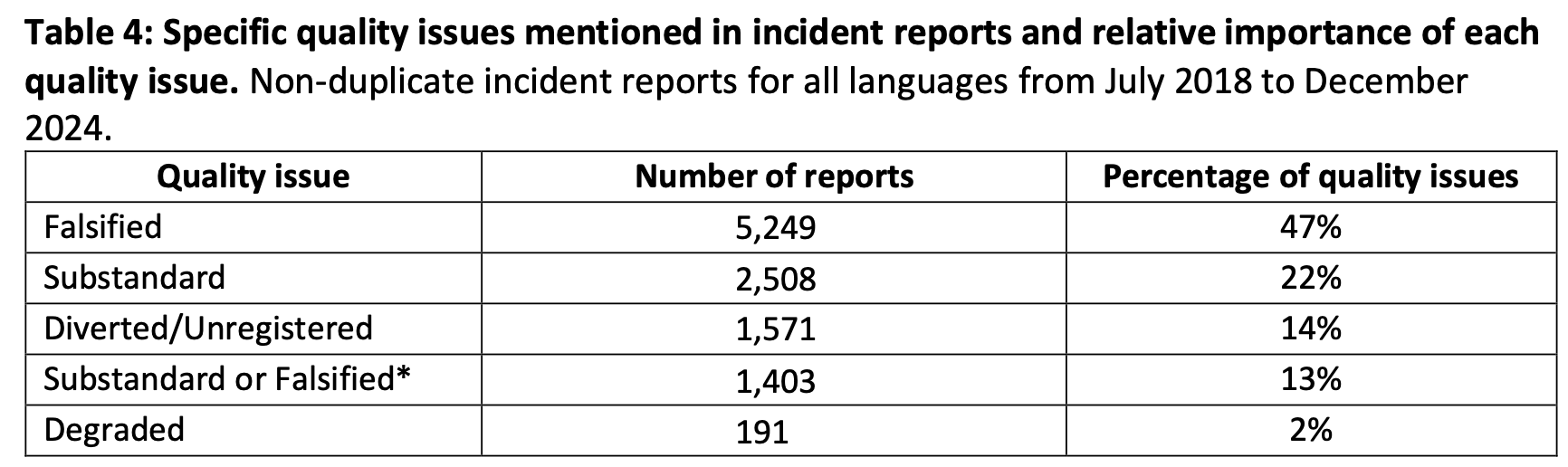 The Medicine Quality Monitoring Globe (MQM Globe) monitors online news media reports about substandard and falsified medical products. Between July 2018 and December 2024, the system captured 2.3 million reports, identifying 20,000 distinct relevant reports and 11,000 specific incidents of poor-quality medical products. The database contains many reports of substandard and falsified COVID-19 medications including ivermectin and hydroxychloroquine.