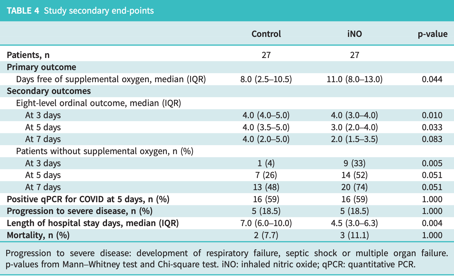 "abstract": "<jats:sec>\n <jats:title>Background</jats:title>\n <jats:p>Inhaled nitric oxide (iNO) in high concentration inhibits SARS-CoV-2 replication in epithelial cells and may prevent severe disease in hospitalised patients. The aim of this study was to evaluate safety and efficacy of iNO 160 ppm on supplemental oxygen in patients hospitalised with COVID-19.</jats:p>\n </jats:sec>\n <jats:sec>\n <jats:title>Methods</jats:title>\n <jats:p>We conducted an open-label, randomised clinical trial in hospitalised patients with COVID-19 receiving supplemental oxygen. Patients were randomly assigned to receive iNO for 6 h in addition to standard of care. The primary safety end-point was assessed by incidence of adverse events. The secondary efficacy end-point was the number of days free of supplemental oxygen within 15 days after randomisation.</jats:p>\n </jats:sec>\n <jats:sec>\n <jats:title>Results</jats:title>\n <jats:p>55 patients were enrolled, 27 in the iNO group and 27 in the control group, and one patient was excluded. No adverse events occurred with the inhalation of nitric oxide. Median (IQR) number of days free of supplemental oxygen was 11 (8.0–13.0) in the iNO group and 8 (2.5–10.5) in the control group (p=0.044). The iNO group had a shorter length of hospital stay (4.5 days (3.0–6.3) compared to 7.0 days (6.0–10.0) in the control group; p=0.004). Clinical score was lower in the iNO group on days 3 and 5 (p=0.010 and p=0.033). The number of patients weaned from ventilatory support on day 3 was higher in the iNO group (n=9 (33%)) when compared to controls (n=1 (4%)); p=0.005. Respiratory failure and mortality did not differ between the groups.</jats:p>\n </jats:sec>\n <jats:sec>\n <jats:title>Conclusion</jats:title>\n <jats:p>The iNO treatment was well tolerated and safe. Among adults hospitalised for COVID-19, iNO 160 ppm for 6 h increased the number of days free from supplemental oxygen, shortened the days of ventilatory support and the length of hospital stay, and improved the clinical score.</jats:p>\n </jats:sec>",