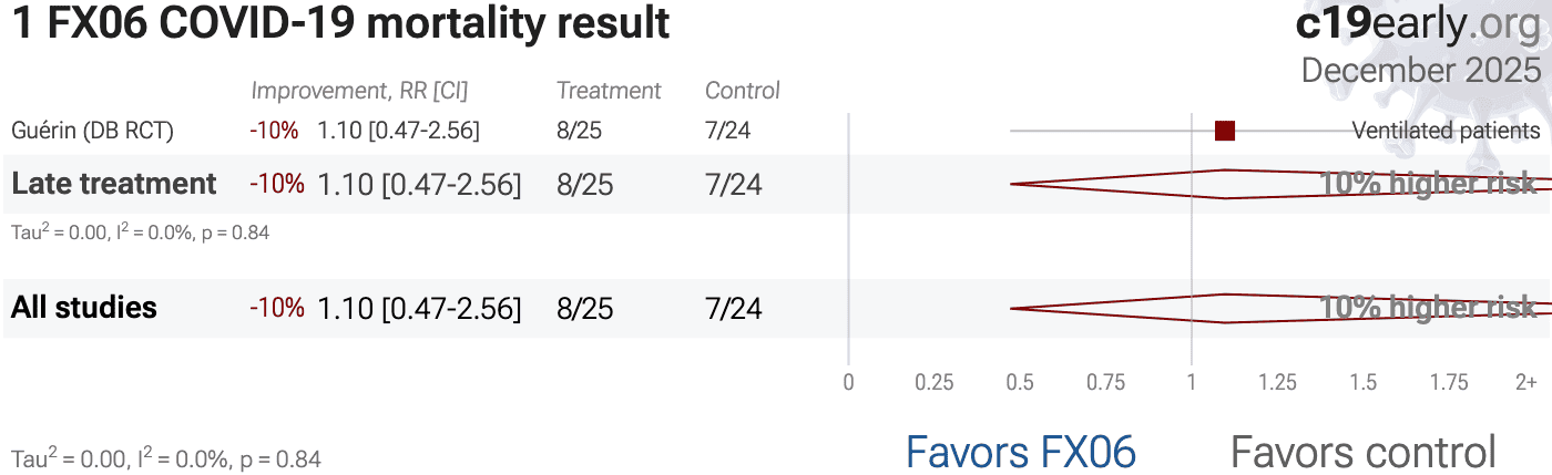 10% higher mortality (p=1). RCT 49 patients with COVID-19-associated ARDS showing no significant effect of FX06 on vascular leakage or mortality.