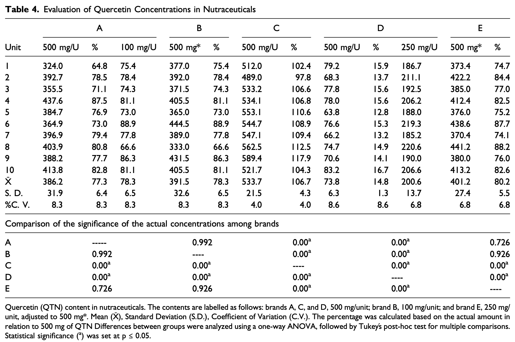 "abstract": "<jats:sec>\n <jats:title>Introduction</jats:title>\n <jats:p>Quercetin, a dietary flavonoid typically consumed as a glycoside, is available in supplements in its aglycone form. This aglycone form is the most studied in preclinical and clinical research because of its antioxidant, anti-inflammatory, and metabolic properties. Several clinical trials have demonstrated the benefits of quercetin for enzymatic, metabolic and cardiovascular health, approximately 60% of these studies fail to verify the actual concentration administered, generating uncertainty on their findings.</jats:p>\n </jats:sec>\n <jats:sec>\n <jats:title>Objective</jats:title>\n <jats:p>This study aimed to evaluate the concentration, stability, and cost–concentration of commercial quercetin nutraceutical formulations.</jats:p>\n </jats:sec>\n <jats:sec>\n <jats:title>Methodology</jats:title>\n <jats:p>The concentrations of five commercial brands were quantified by high-performance liquid chromatography. Stability was assessed over 6 months at both room temperature and 40°C.</jats:p>\n </jats:sec>\n <jats:sec>\n <jats:title>Results</jats:title>\n <jats:p>Only one brand contained the amount labeled; three contained approximately 80%, and one contained merely 14.8%. This study is the first to evaluate the long and thermal stability of quercetin in nutraceutical products, demonstrating that the active ingredient remains stable for at least 6 months. Brand C was identified as the most suitable option.</jats:p>\n </jats:sec>\n <jats:sec>\n <jats:title>Conclusion</jats:title>\n <jats:p>There was significant variability in the quercetin concentration of commercial supplements. These findings underscore the need for stricter regulatory oversight to ensure the quality, therapeutic efficacy, and safety of nutraceutical products.</jats:p>\n </jats:sec>",