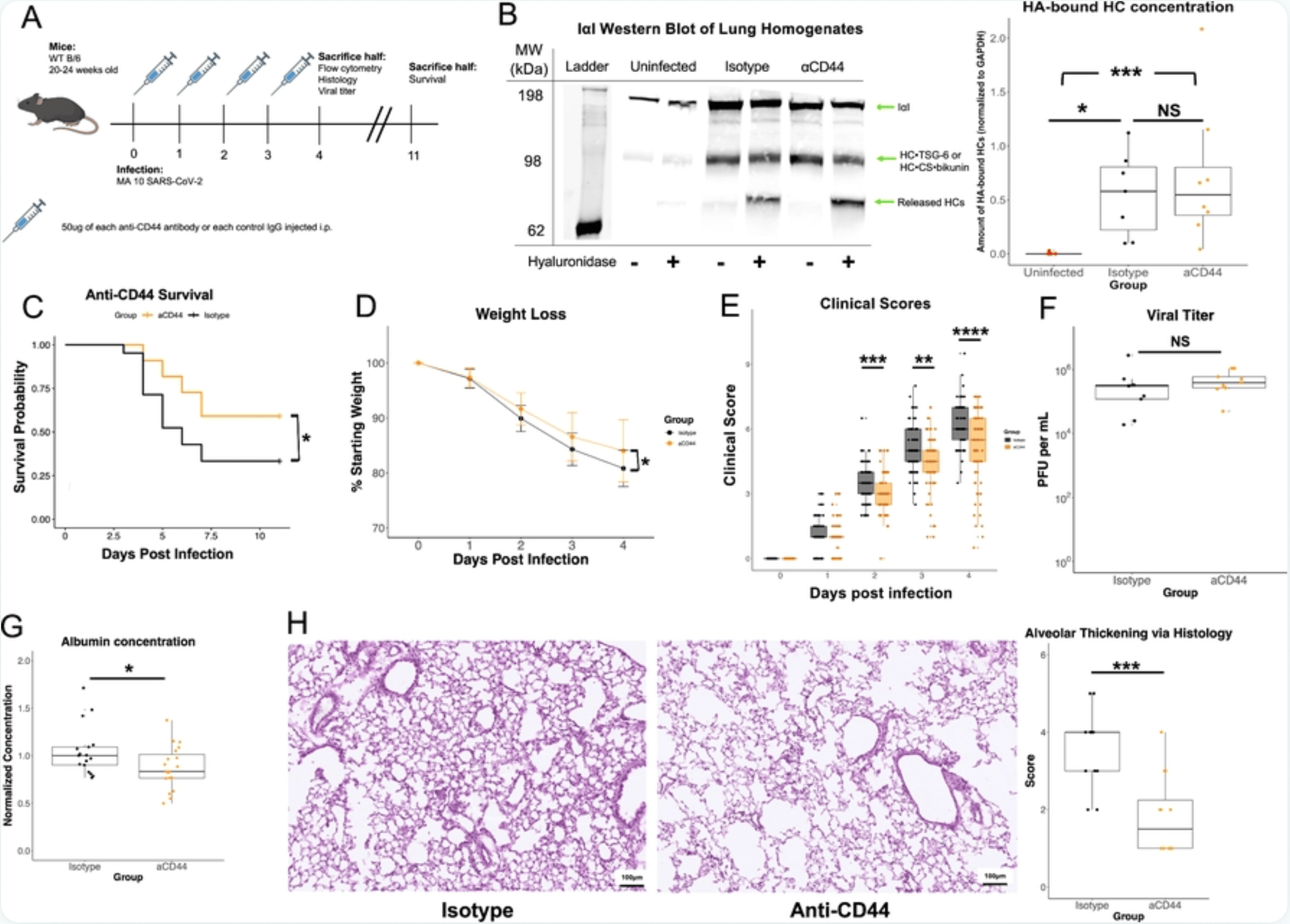 The novel respiratory disease COVID-19 caused by the coronavirus SARS-CoV-2 continues to be a public health emergency worldwide, and there is a need for more effective therapy for patients. The relationship between the extracellular matrix and the host immune response to infection is severely understudied. Deposition of the polysaccharide hyaluronan (HA) into the lungs is associated with more severe COVID-19 disease outcomes. HA is a major component of the extracellular matrix in connective tissues and is abundant in many parts of the body, including cartilage, skin, brain, and vitreous body. CD44 is the primary receptor for HA and is found on almost all immune cells in the lung. Known functions of CD44 include mediation of immune cell migration, activation, and differentiation. We hypothesized that increased HA deposition during COVID-19 increases CD44-mediated immune cell infiltration into lungs and results in more severe pathology. Here, we report that in mice infected with a mouse-adapted strain of SARS-CoV-2, treatment with a combination of two anti-CD44 monoclonal antibodies confers a significant survival benefit and reduces weight loss and clinical score of the mice on Day 4 post infection. We show that anti-CD44 treatment decreases many key cytokines and chemokines in the bronchoalveolar lavage fluid on Day 4. With flow cytometry, we show that anti-CD44 reduces the numbers of neutrophils in infected lungs. We also show through immunofluorescence that treatment with anti-CD44 antibodies reduces colocalization of HA and CD45 in lung sections, indicating that HA's interaction with immune cells contributes to pathology. Our findings demonstrate that disruption of HA-receptor interactions is a way to prevent inflammatory pathology in pulmonary infection.