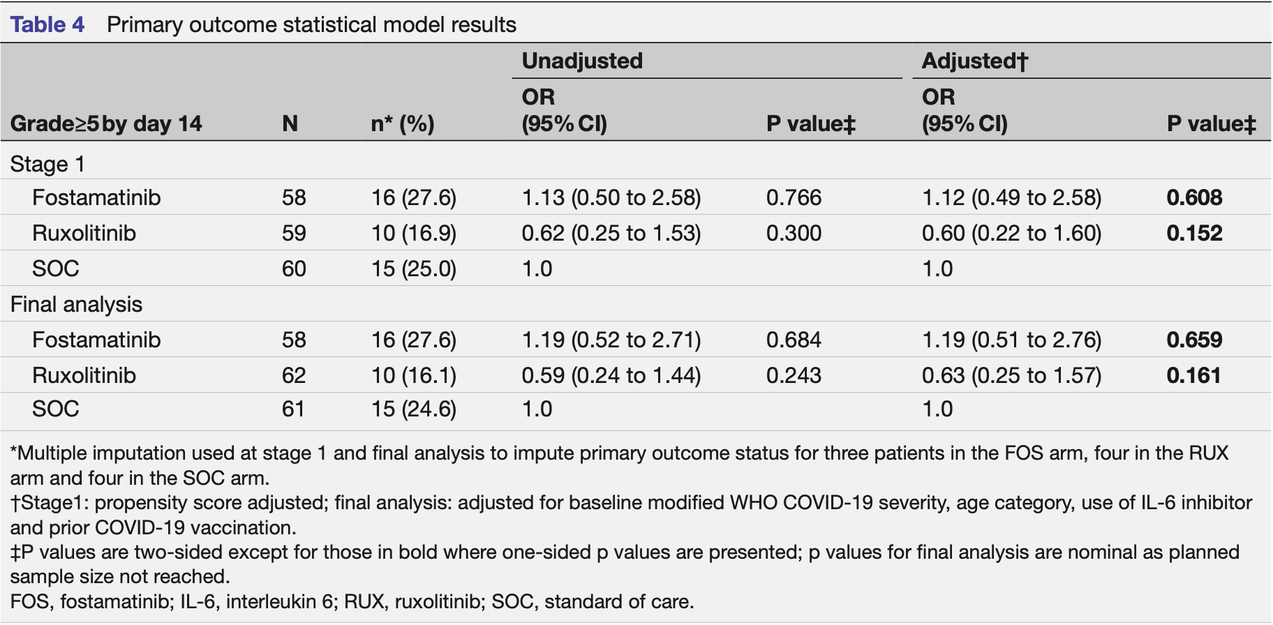 "abstract": "<jats:sec>\n <jats:title>Objectives</jats:title>\n <jats:p>To determine the safety and efficacy of ruxolitinib (RUX) and fostamatinib (FOS) compared with standard of care (SOC) in patients requiring hospital admission for the treatment of COVID-19 pneumonia.</jats:p>\n </jats:sec>\n <jats:sec>\n <jats:title>Design</jats:title>\n <jats:p>Adaptive multiarm, multistage, randomised, open-label trial (three arm, two stage).</jats:p>\n </jats:sec>\n <jats:sec>\n <jats:title>Setting</jats:title>\n <jats:p>Five hospitals in England between October 2020 and September 2022.</jats:p>\n </jats:sec>\n <jats:sec>\n <jats:title>Participants</jats:title>\n <jats:p>Hospitalised patients (≥18 years) with COVID-19 pneumonia defined by a modified WHO COVID-19 severity grade of 3 or 4.</jats:p>\n </jats:sec>\n <jats:sec>\n <jats:title>Interventions</jats:title>\n <jats:p>Participants were randomly assigned 1:1:1 to receive RUX (10 mg two times per day for 7 days then 5 mg two times per day for 7 days), FOS (150 mg two times per day for 7 days then 100 mg two times per day for 7 days) or SOC.</jats:p>\n </jats:sec>\n <jats:sec>\n <jats:title>Main outcome measures</jats:title>\n <jats:p>Primary outcome was development of severe COVID-19 pneumonia (modified WHO severity grade≥5) within 14 days of randomisation. Secondary outcomes included mortality, invasive and non-invasive ventilation, venous thromboembolism, duration of hospital stay, readmissions, inflammatory markers and serious adverse events (SAEs).</jats:p>\n </jats:sec>\n <jats:sec>\n <jats:title>Results</jats:title>\n <jats:p>At stage 1, 181 patients were randomised, with 4 assessed as ineligible post randomisation. FOS was stopped early for futility with 16 participants (27.6%, n=58) developing severe COVID-19 pneumonia compared with 15 (25.0%, n=60) in the SOC arm (adjusted odds ratio (aOR) compared with SOC: 1.12; 95% CI 0.49 to 2.58; p=0.608). RUX progressed to stage 2 but the trial was stopped early due to slow recruitment. At the final analysis, 10 participants (16.1%, n=62) developed severe COVID-19 pneumonia in the RUX arm compared with 15 (24.6%, n=61) in the SOC arm (aOR: 0.63; 95% CI 0.25 to 1.57; p=0.161). Four (7.4%) participants in the FOS arm, none in the RUX arm and three (5.5%) in the SOC arm died within 14 days of randomisation. Infections were the most frequently reported SAE and were numerically higher in the FOS (10, 17.2%) and RUX (10, 16.1%) arms compared with SOC (7, 11.5%). Two unexpected serious adverse reactions occurred in the RUX arm only.</jats:p>\n </jats:sec>\n <jats:sec>\n <jats:title>Conclusions</jats:title>\n <jats:p>We found no evidence that FOS was superior to SOC for the treatment of COVID-19 pneumonia in patients requiring hospital admission. Due to early stopping, the trial was underpowered to establish RUX’s effect in this population. Further study is needed.</jats:p>\n </jats:sec>\n <jats:sec>\n <jats:title>Trial registration number</jats:title>\n <jats:p>\n <jats:ext-link xmlns:xlink=\"http://www.w3.org/1999/xlink\" ext-link-type=\"clintrialgov\" xlink:href=\"NCT04581954\">NCT04581954</jats:ext-link>\n ; EUDRA-CT:\n <jats:ext-link xmlns:xlink=\"http://www.w3.org/1999/xlink\" ext-link-type=\"uri\" xlink:href=\"https://www.clinicaltrialsregister.eu/ctr-search/trial/2020-001750-22/GB\">https://www.clinicaltrialsregister.eu/ctr-search/trial/2020-001750-22/GB</jats:ext-link>\n .\n </jats:p>\n </jats:sec>",