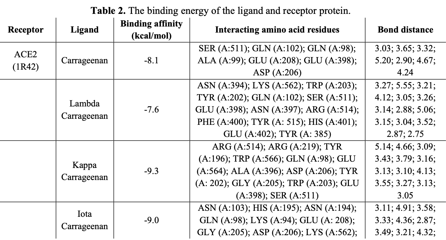 Thet, H., The potential of carrageenan for the drug discovery of COVID-19 via molecular docking with angiotensin-converting enzyme 2 (ACE2) and the main protease (Mpro) of SARS-CoV-2, Journal of Bioinformatics and Genomics, doi:10.18454/jbg.2022.18.2.001.
