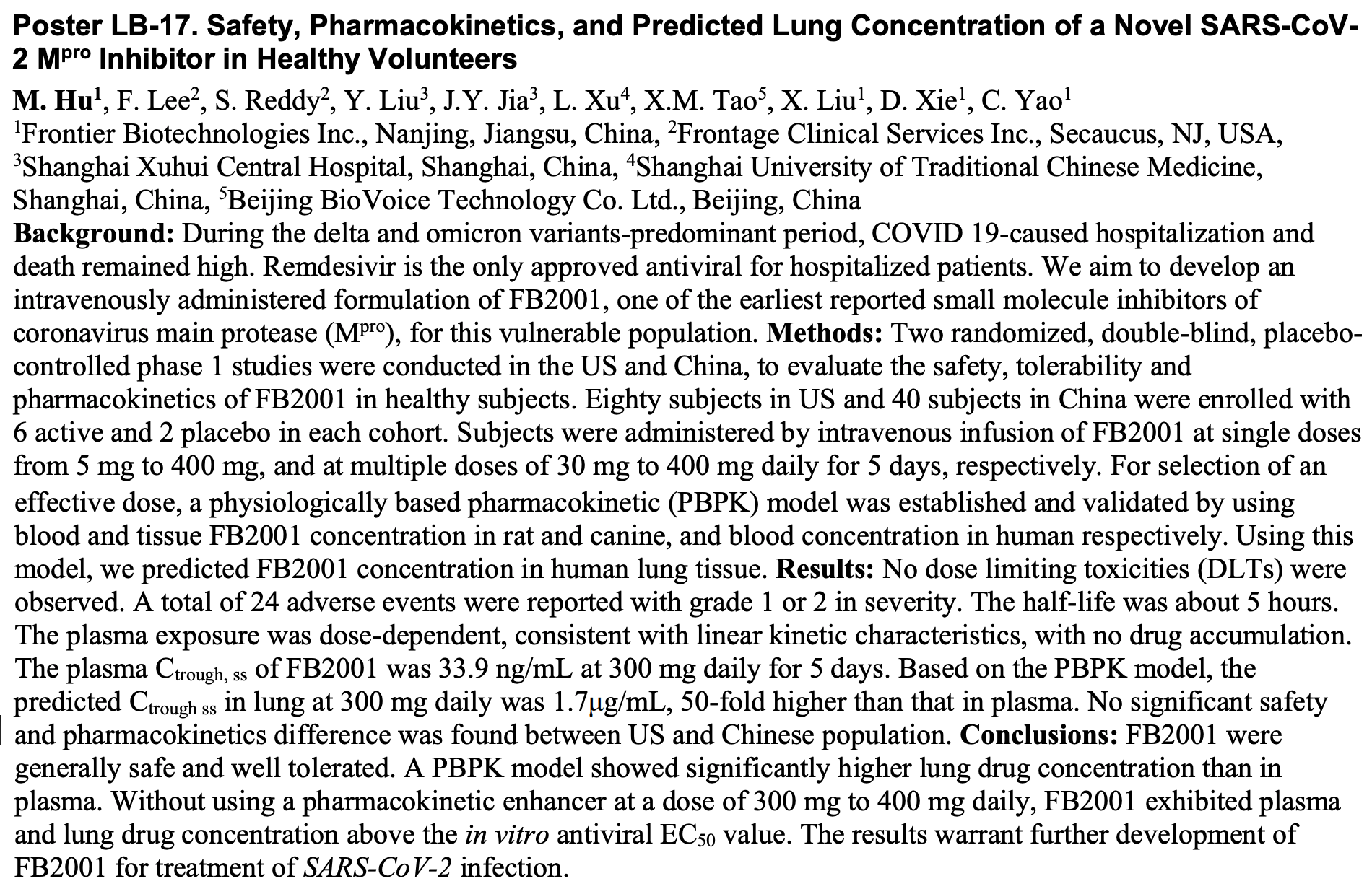 Phase 1 RCT 120 healthy volunteers (80 US, 40 China) showing safety and tolerability of FB2001 (bofutrelvir).