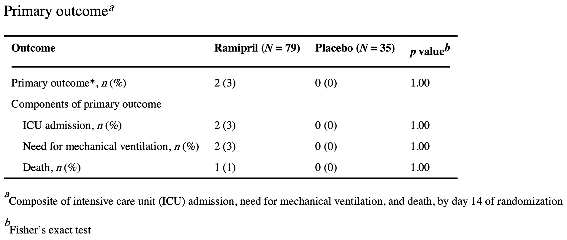 Apr 2020, A Randomized, Double-blind, Placebo Controlled Trial to Evaluate the Efficacy of Ramipril to Prevent ICU Admission,