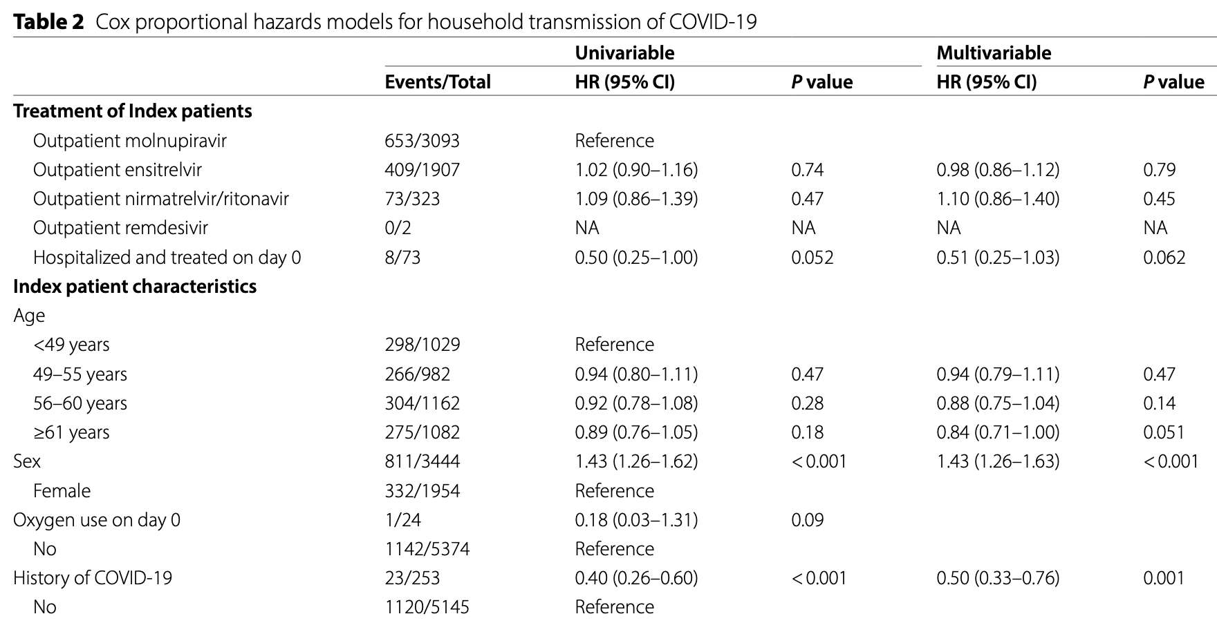 "abstract": "<jats:title>Abstract</jats:title>\n <jats:sec>\n <jats:title>Background</jats:title>\n <jats:p>Antiviral treatment reduces influenza transmission and differs in effectiveness among agents. Although SARS-CoV-2 antivirals lower viral shedding, their role in preventing secondary household transmission and the differences between agents remain unclear.</jats:p>\n </jats:sec>\n <jats:sec>\n <jats:title>Methods</jats:title>\n <jats:p>We conducted a retrospective cohort study using the JMDC administrative claims database in Japan. The study included married-couple households between 1 April and 31 August 2023, when the Omicron XBB variant was predominant. Households in which at least one person had been diagnosed with Coronavirus Disease 2019 (COVID-19) were included. We excluded households if the index patient did not receive antiviral treatment on day 0, or the spouse was diagnosed on day 0 or 1. The primary outcome was subsequent infection in the spouse by day 7. Cox proportional hazards models were used to estimate hazard ratios (HRs), after adjusting for potential confounders.</jats:p>\n </jats:sec>\n <jats:sec>\n <jats:title>Results</jats:title>\n <jats:p>Of the 326,827 married-couple households, 5,398 met the inclusion criteria. Among them, 1,143 households (21.2%) experienced presumed secondary transmission by day 7. The cumulative transmission rate, estimated using the Kaplan–Meier method, was lower among hospitalized patients (<jats:italic>n</jats:italic> = 73, 11.0%, 95% confidence interval [CI]: 5.7–20.8%) than among outpatients (<jats:italic>n</jats:italic> = 5,325, 21.5%, 95% CI: 20.4–22.6%, <jats:italic>p</jats:italic> = 0.035). Transmission rates did not significantly differ among the outpatient antiviral groups: molnupiravir (<jats:italic>n</jats:italic> = 3,093, 21.3%, 95% CI: 19.9–22.8%), ensitrelvir (<jats:italic>n</jats:italic> = 1,907, 21.6%, 95% CI: 19.8–23.6%), and nirmatrelvir/ritonavir (<jats:italic>n</jats:italic> = 323, 22.8%, 95% CI: 18.6–27.8%, <jats:italic>p</jats:italic> = 0.74). In multivariable Cox analysis, male sex (adjusted HR 1.43, 95% CI: 1.26–1.63; <jats:italic>p</jats:italic> < 0.001), history of COVID-19 in the index patient (adjusted HR 0.50, 95% CI: 0.33–0.76; <jats:italic>p</jats:italic> = 0.001), and history of COVID-19 in the partner (adjusted HR 0.31, 95% CI: 0.21–0.45; <jats:italic>p</jats:italic> < 0.001) were significantly associated with transmission risk. Hospitalization tended to be associated with a lower risk of transmission (adjusted HR, 0.51; 95% CI, 0.25–1.03; <jats:italic>p</jats:italic> = 0.062).</jats:p>\n </jats:sec>\n <jats:sec>\n <jats:title>Conclusions</jats:title>\n <jats:p>Household transmission rates were not statistically different among three different outpatient oral antiviral agents. Hospitalization was associated with a trend toward lower transmission rates, possibly due to physical isolation.</jats:p>\n </jats:sec>",