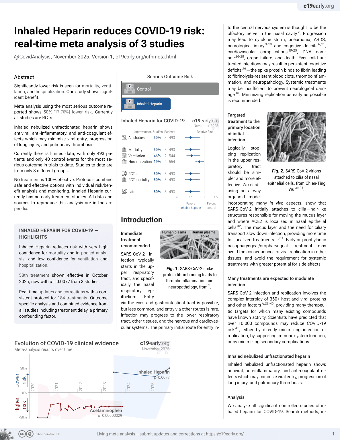 Evolution of COVID-19 clinical evidence Meta-analysis results over time Inhaled Heparin p=0.0077 Acetaminophen p=0.00000029 2020 2021 2022 2023 2024 2025 Lowerrisk Higherrisk c19early.org November 2025 50% 0% -50%