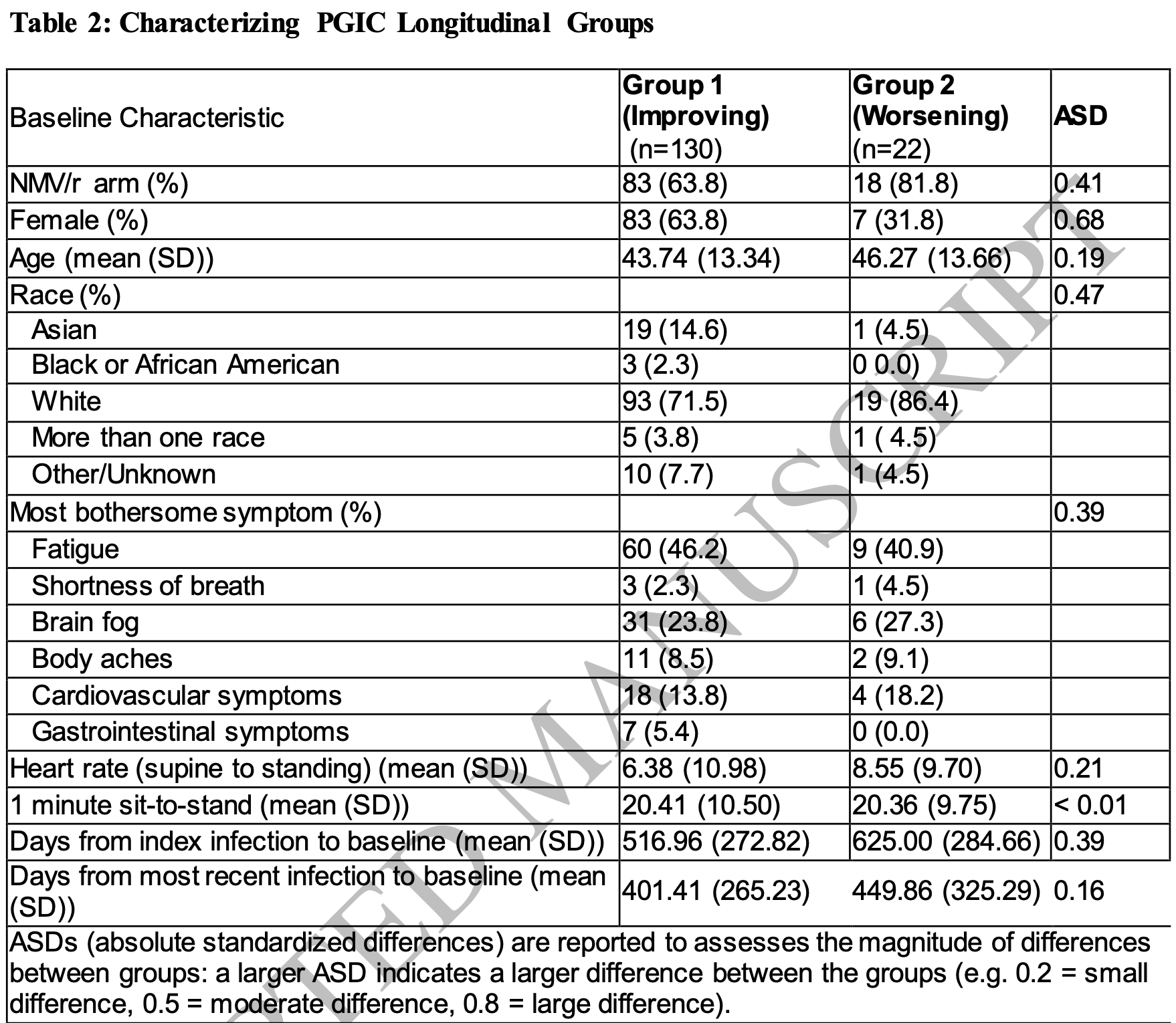 Methods: We performed latent class trajectory modeling (LCTM) on PRO measuresincluding the Patient Global Impression of Severity (PGIS), Patient Global Impression of Change (PGIC), PROMIS domains, and core symptoms-among 155 randomized participants. Participants were followed for 15 weeks with serial symptom assessments. Trajectory groups were identified using Bayesian Information Criteria and characterized using descriptive statistics and absolute standardized differences.