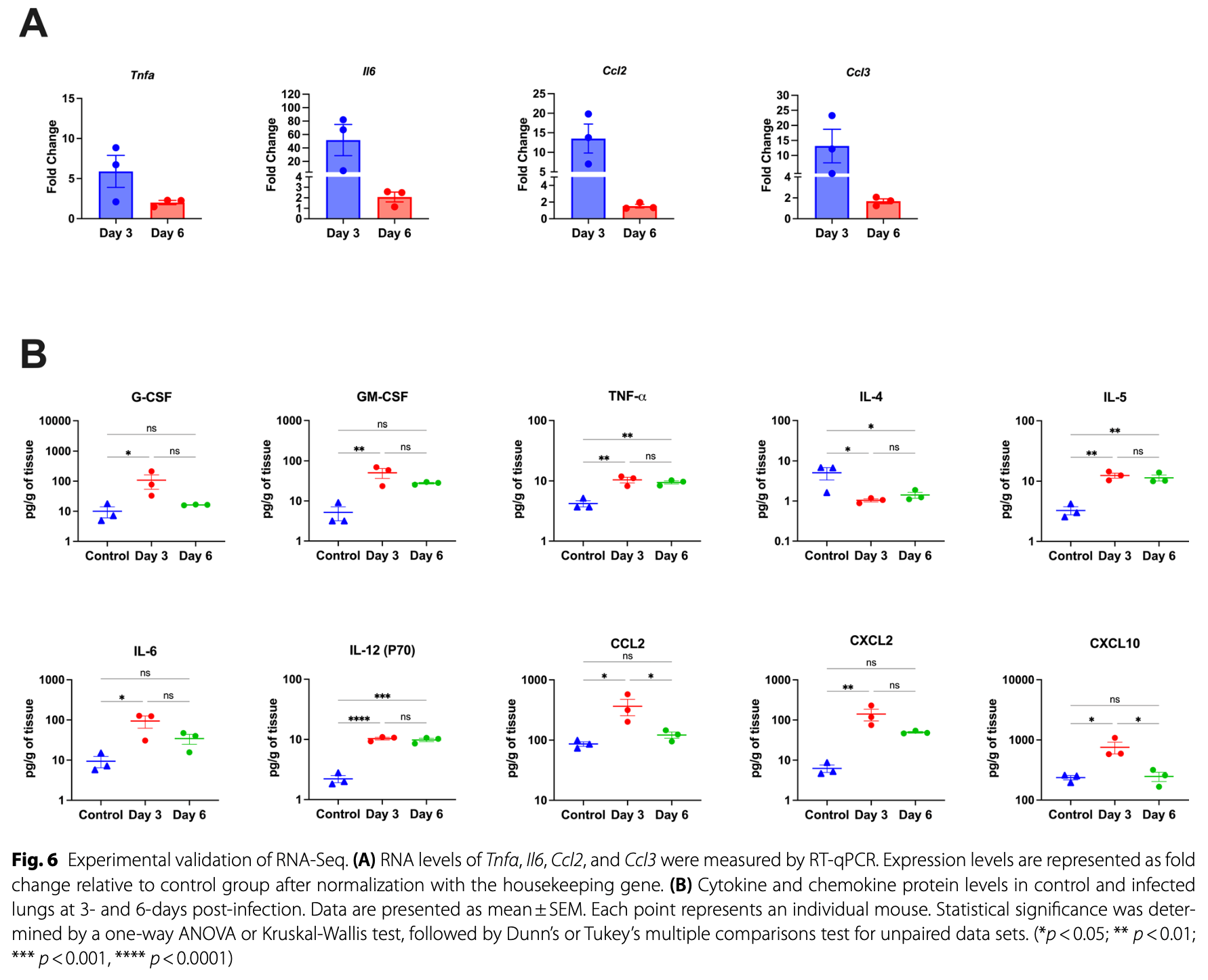 Methods We intranasally infected 6-week-old wild-type C57BL/6J mice with the SARS-CoV-2 (B.1.351 strain) and collected lungs at 3-and 6-days post-infection for RNA-sequencing. We used the Limma-Voom package to identify differentially expressed genes (DEGs) and the fgsea package for pathway enrichment analysis. We used Cytoscape to identify hub genes and gene networks. Lastly, we employed RT-qPCR and multiplex assay to validate the RNA-seq data.