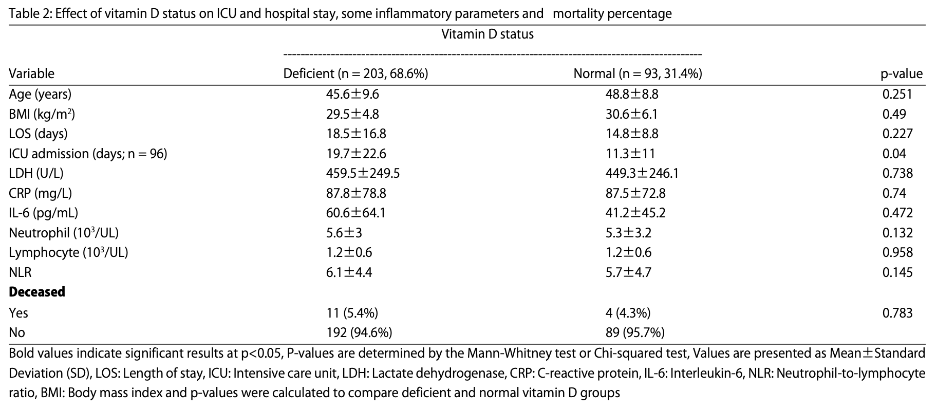 Retrospective 296 hospitalized COVID-19 patients in Qatar showing longer ICU stays with vitamin D deficiency. No significant difference was found for hospital length of stay or mortality.