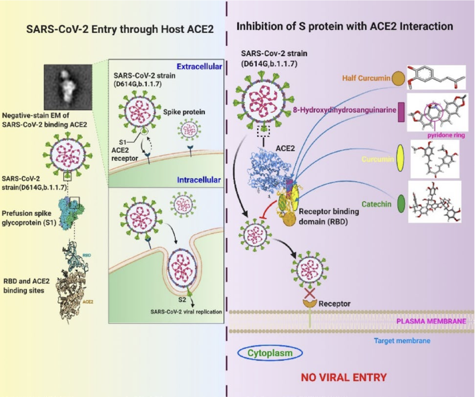 In silico study showing that curcumin, half-curcumin, catechin, and 8-hydroxydihydrosanguinarine (8-HDS) bind strongly to the spike (S) proteins of SARS-CoV-2 D614G and B.1.1.7 variants, potentially inhibiting viral entry via ACE2.