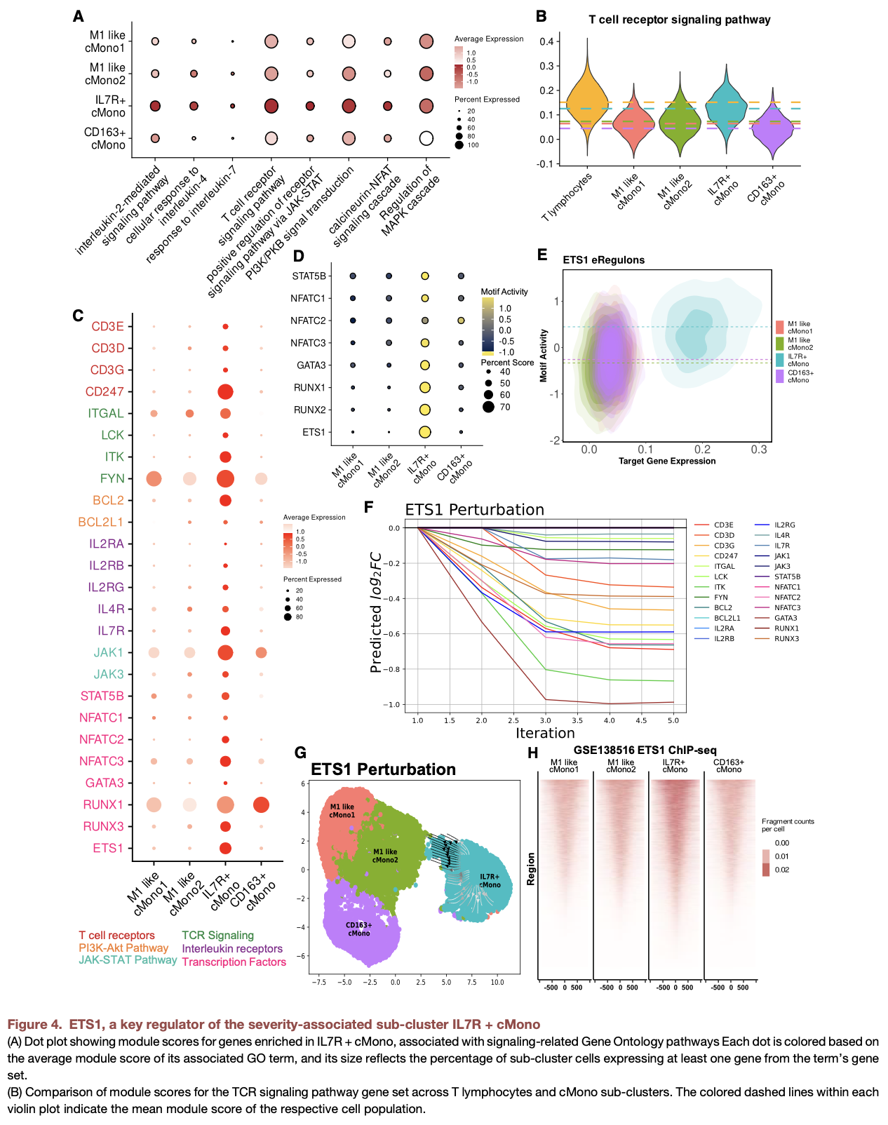 severity-associated subtypes (IL7R+ cMono and CD163+ cMono) are identified • In IL7R+ cMono, ETS1 drives T cell-like signaling and immune suppressive programs