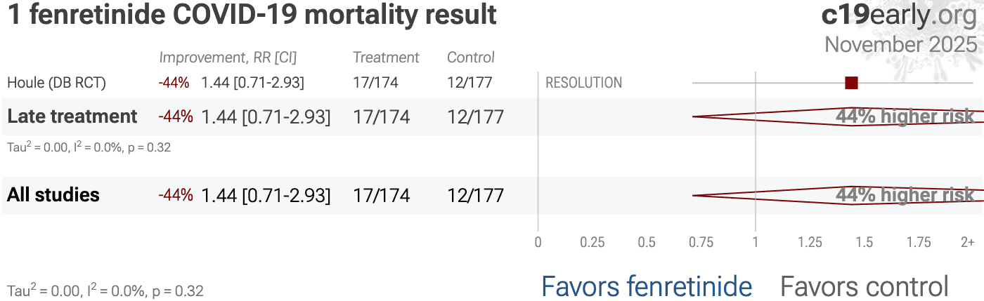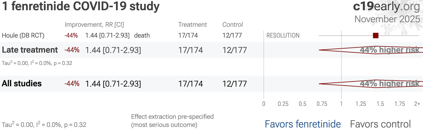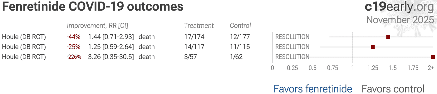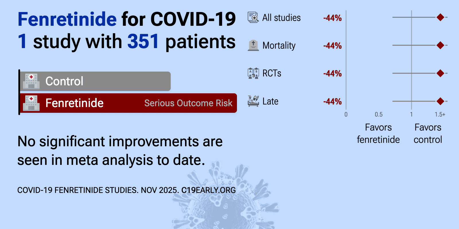 | 44% higher mortality (p=0.34). RCT 125 hospitalized COVID-19 patients showing no significant benefits with fenretinide (LAU-7b). | ||