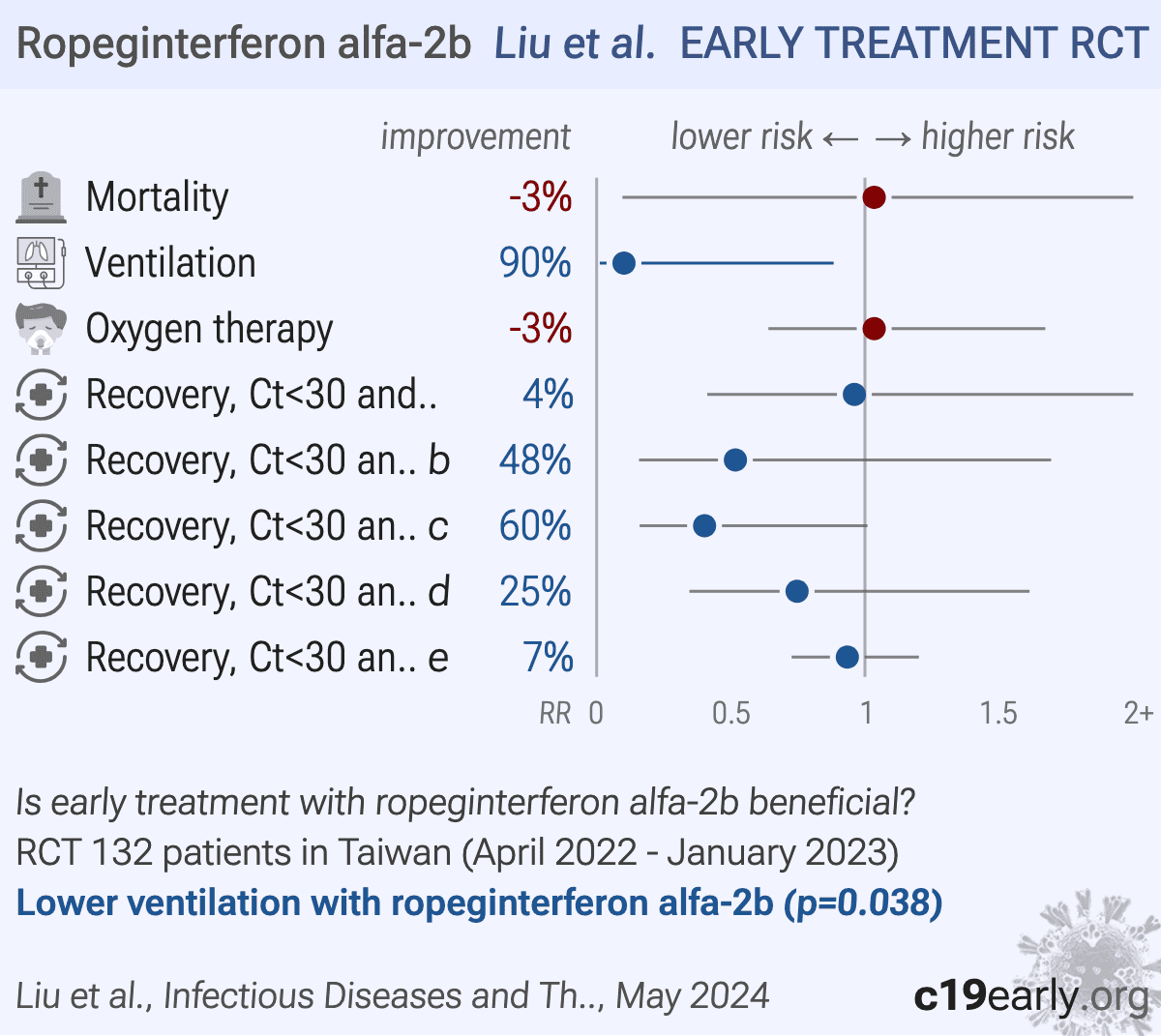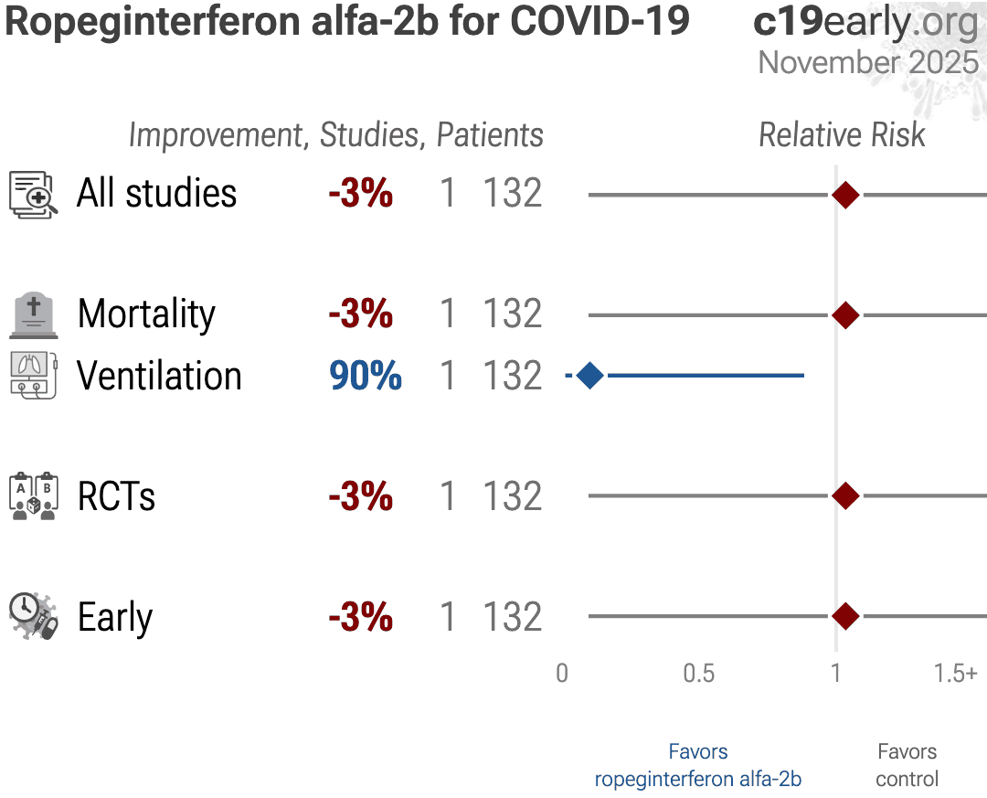 RCT 132 hospitalized moderate COVID-19 patients in Taiwan showing higher rates of viral clearance or discharge by day 11 with ropeginterferon alfa-2b. The ropeginterferon alfa-2b group also showed higher rates of improvement in lung infiltration on day 5 and WHO clinical progression scores on day 8. There was no significant difference in mortality.