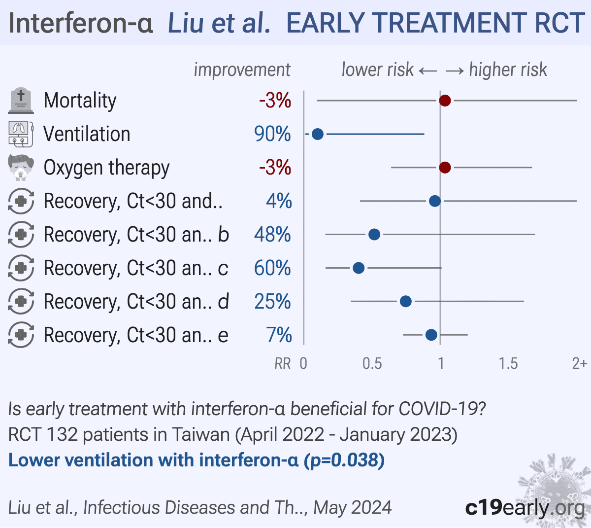 RCT 132 hospitalized moderate COVID-19 patients in Taiwan showing higher rates of viral clearance or discharge by day 11 with ropeginterferon alfa-2b. The ropeginterferon alfa-2b group also showed higher rates of improvement in lung infiltration on day 5 and WHO clinical progression scores on day 8. There was no significant difference in mortality.