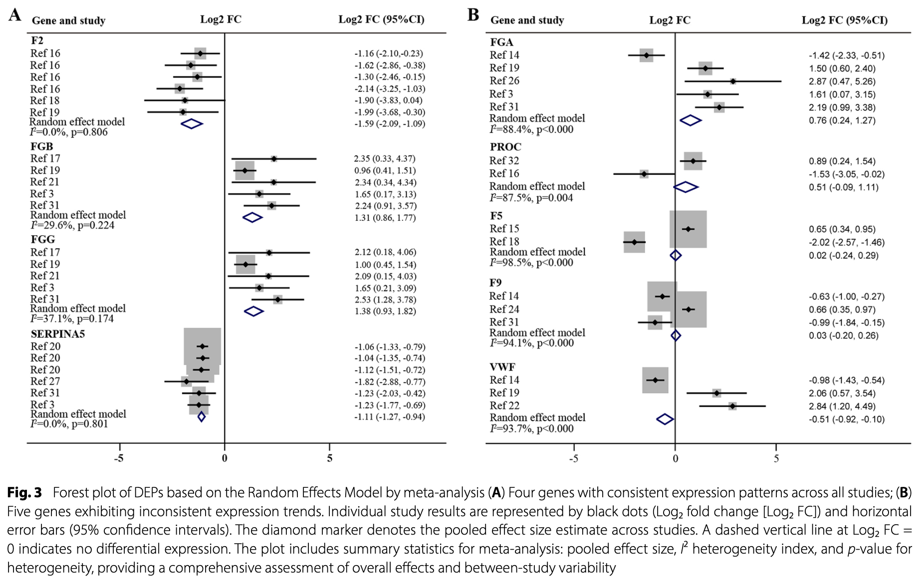 genes (e.g., FGB, SERPINA5) were found. Stata confirmed consistent expression of FGB, SERPINA5, FGG, and F2.