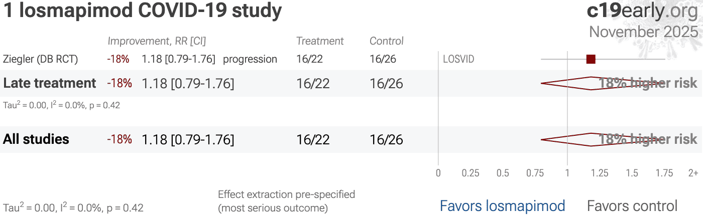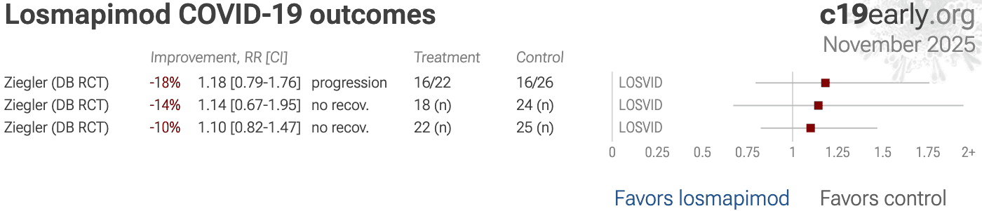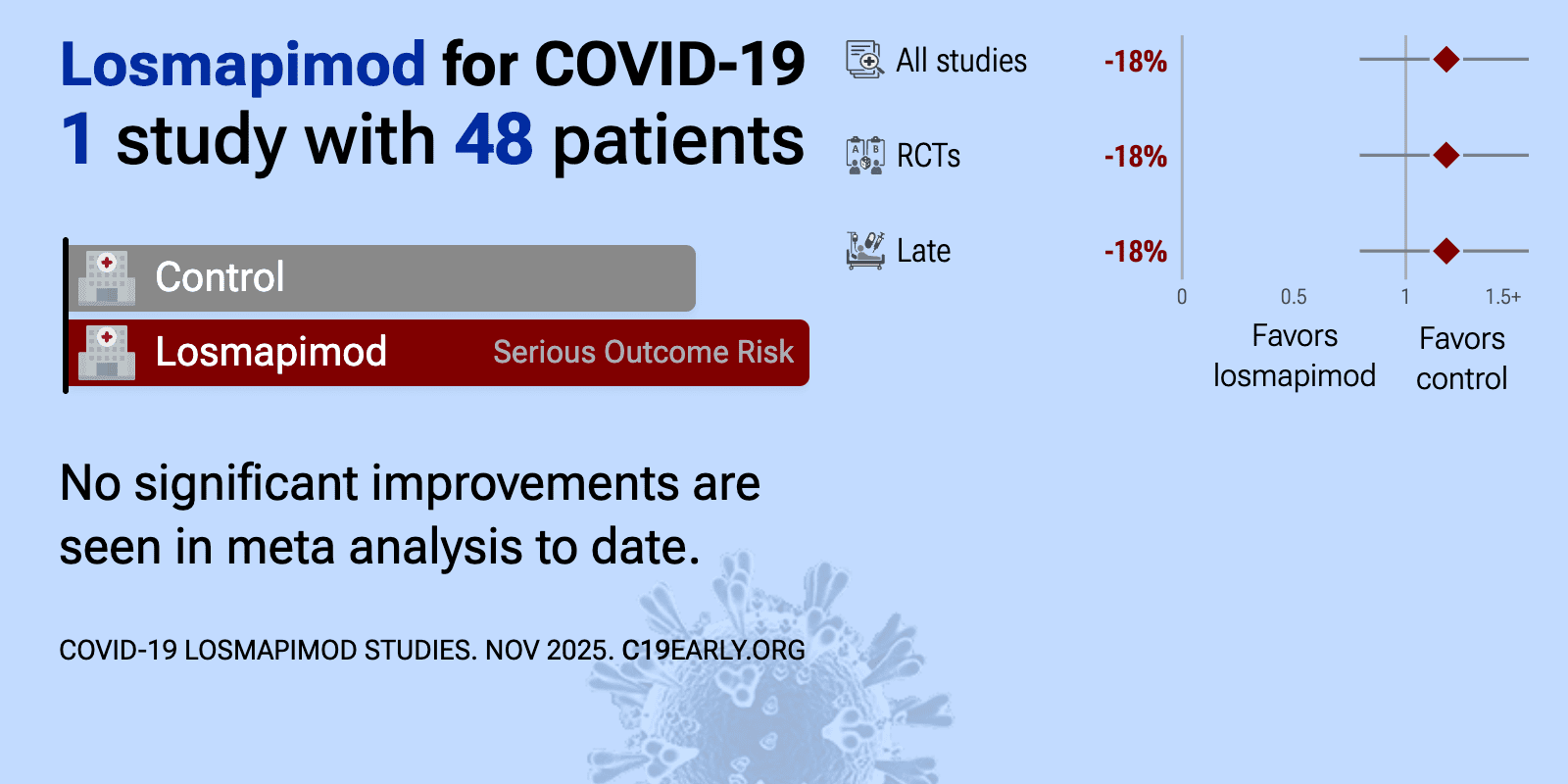 | 18% higher progression (p=0.54) and 14% worse recovery (p=0.64). RCT 52 hospitalized COVID-19 patients showing no significant differences with losmapimod treatment. | ||