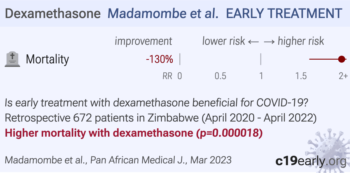 Retrospective 672 COVID-19 patients in Zimbabwe, showing lower mortality with vitamin C and azithromycin treatment, and higher mortality with dexamethasone treatment.