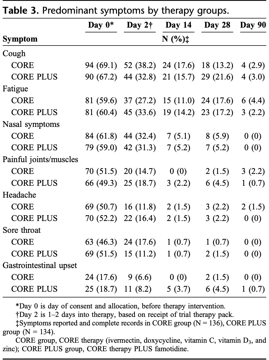Results: No viral rebound was experienced by any participants who took the 10-day therapy. Symptoms were reported daily until day 10, and at days 14, 28, and 90. The addition of famotidine resulted in less fatigue and nasal symptoms at day 14. These 5-component and 6-component interventions (ie, core therapy with and without famotidine) were equally safe and well tolerated.